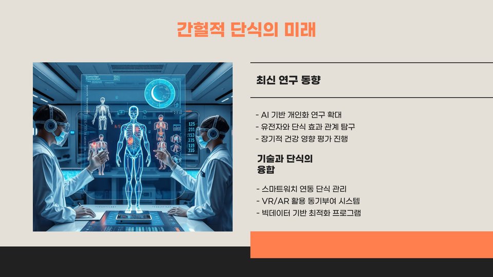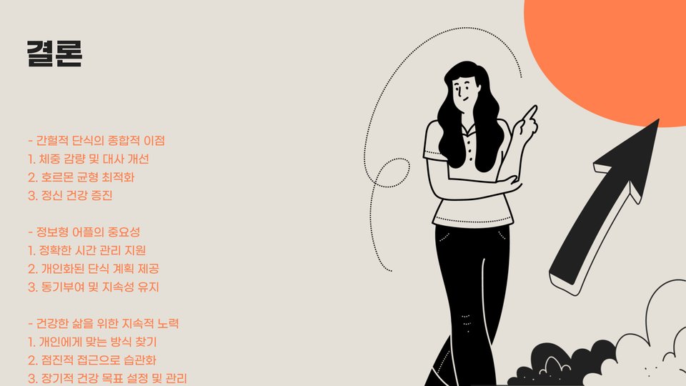 셋째, 무리한 목표 설정은 오히려 독이 될 수 있습니다. 현실적이고 실행 가능한 목표를 세우고, 이를 콘텐츠에 기반하여 조절하는 것이 바람직합니다. 간헐적단식은 단순한 식사 패턴이 아니라, 건강한 생활로 가는 한 걸음입니다.