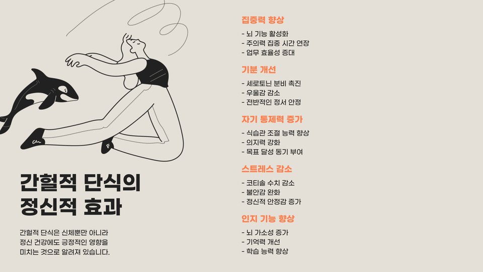 스트레스 감소와 집중력 향상은 간헐적단식 방식의 또 다른 장점입니다. 식사를 계획하는 과정 속에서 자신의 몸의 신호를 이해하게 되고, 결과적으로 정신적 안정감을 느낄 수 있습니다. 이런 이유로 많은 사람들이 간헐적단식을 통해 건강한 삶을 영위하고 있다는 사실을 잊지 말아야 합니다.