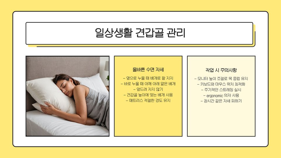 • 관리: 꾸준한 운동 및 스트레칭, 좋은 자세 유지.