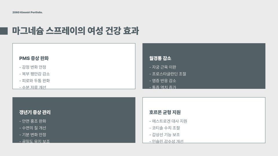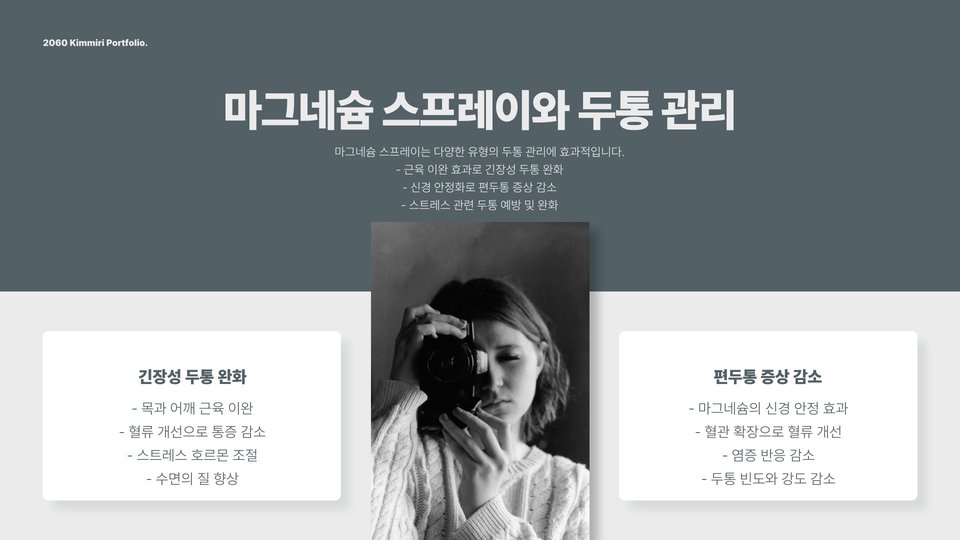 마그네슘 스프레이의 가장 큰 장점 중 하나는 근육통 완화입니다. 특히, 운동 후 심한 근육통이 발생할 경우 스프레이를 해당 부위에 뿌리면 빠르게 통증을 줄일 수 있습니다. 이외에도 마그네슘은 체내 염증을 감소시키고 스트레스를 완화하는 데 도움이 됩니다. 이러한 효과는 체내 마그네슘 농도가 낮아질 경우 제대로 이뤄지지 않기 때문에, 일상적으로 마그네슘을 보충하는 것이 중요합니다.