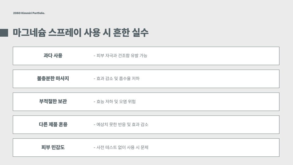 마그네슘 스프레이는 효과적인 제품이지만, 사용 시 몇 가지 주의할 점이 있습니다. 첫 번째로, 알레르기 반응이 발생할 수 있으므로 사용 전 피부 패치를 통해 확인하는 것이 좋습니다. 특히 민감성 피부를 가진 경우, 자극이 있을 수 있으므로 주의해야 합니다.