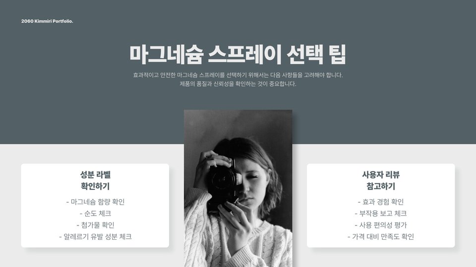 이러한 점들을 종합해 볼 때, 마그네슘 스프레이는 단순한 보충제를 넘어 일상생활에서 유용한 아이템으로 자리잡을 수 있습니다. 특히, 격렬한 운동을 하는 사람이나 스트레스가 많은 환경에서 일하는 사람들에게는 더욱 필요할 수 있습니다. 마그네슘의 이점을 직접 체험해 보기 위해 소량을 사용해보고 체험하는 것을 추천합니다.
