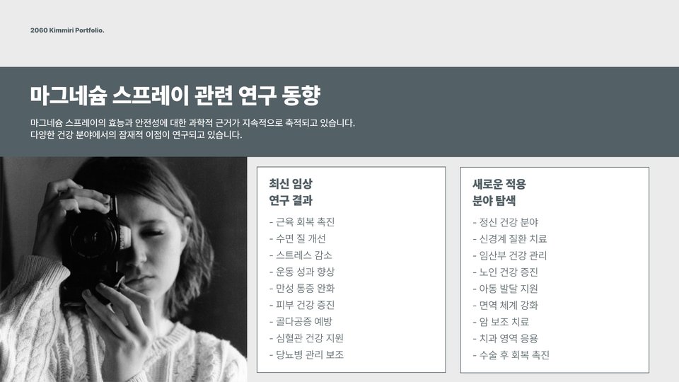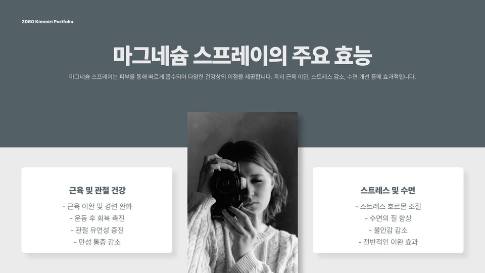 Tags: 마그네슘, 마그네슘 스프레이, 근육통 완화, 피부 건강, 마그네슘 효능, 운동 후 회복, 부작용 없는 스프레이, 건강, 미네랄, 스프레이 사용법