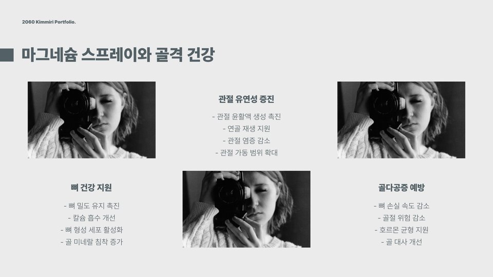 마그네슘 스프레이는 근육 통증 완화에 효과적입니다. 운동 후 근육의 긴장이 느껴질 때, 스프레이를 뿌리면 통증을 줄이는 데 도움을 줄 수 있습니다. 예를 들어, 마라톤 후 다리 통증이 심할 때 마그네슘 스프레이를 사용하면 빠르게 진정 효과를 경험할 수 있습니다. 또한, 마그네슘은 피부 건강에도 도움이 됩니다. 피부에 직접 적용하면 보습 효과를 주고, 염증을 완화하는 데 기여할 수 있습니다.