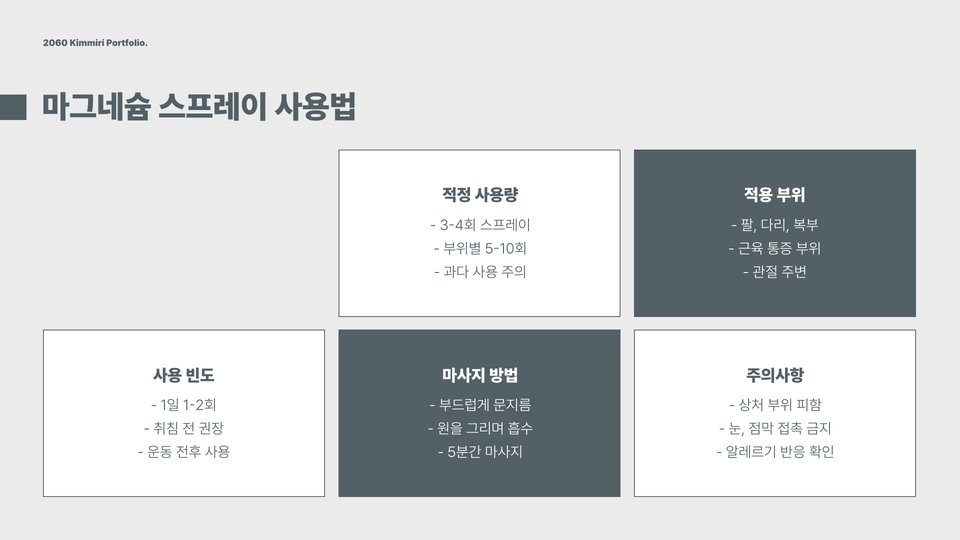 마그네슘 스프레이는 피부에 쉽게 사용 가능한 제품으로 설계되어 있습니다. 사용 전에는 우선 피부가 깨끗한지 확인하고, 필요한 부위에 스프레이를 적당량 뿌려주는 것이 좋습니다. 사용 후에는 손을 깨끗이 씻고 다른 피부 부위에 직접적으로 닿지 않도록 주의해야 합니다. 일반적으로 하루에 1-2회 사용이 권장되며, 개인의 필요에 따라 조절할 수 있습니다.