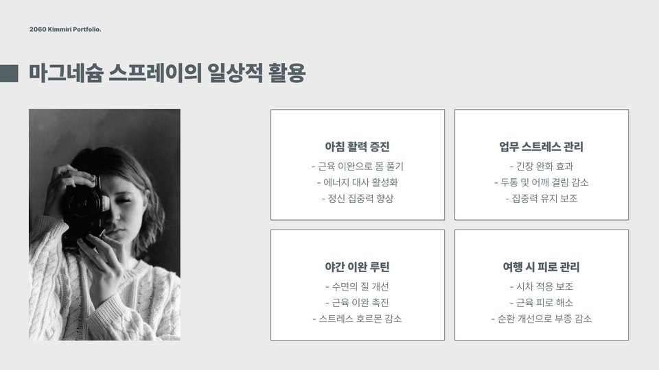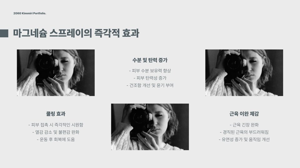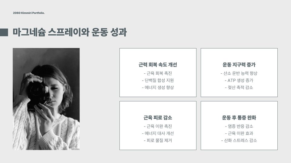 - 마그네슘 스프레이는 빠른 흡수로 근육통 완화에 효과적입니다.