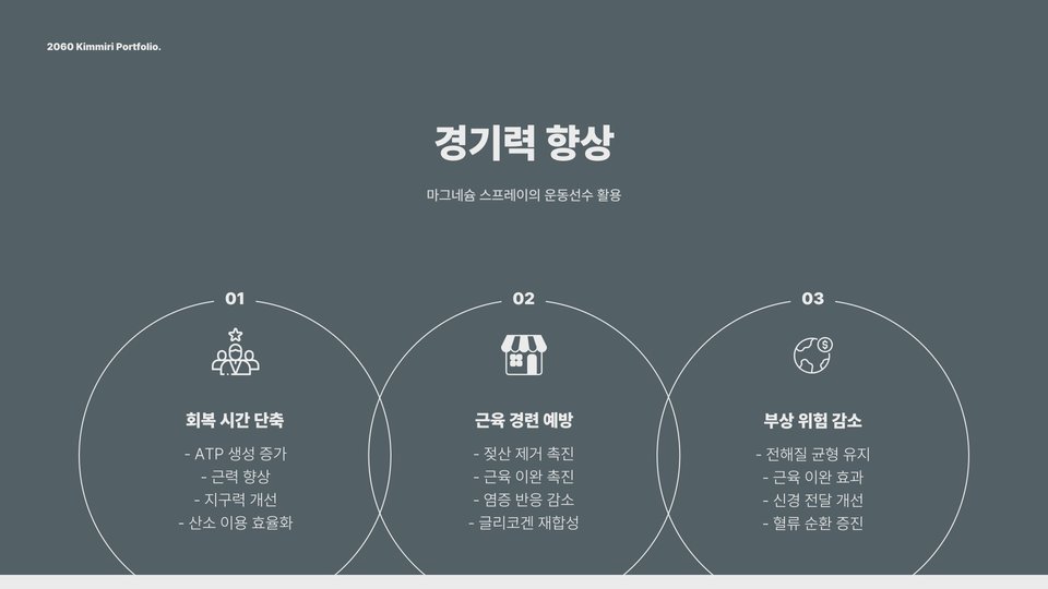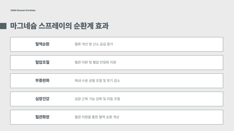 - 마그네슘 스프레이는 빠른 흡수로 근육통 완화에 효과적입니다.