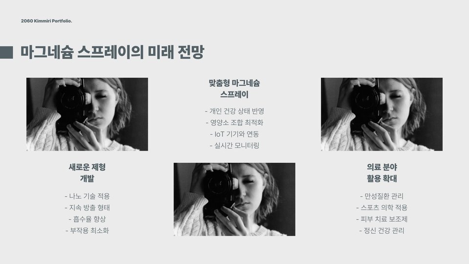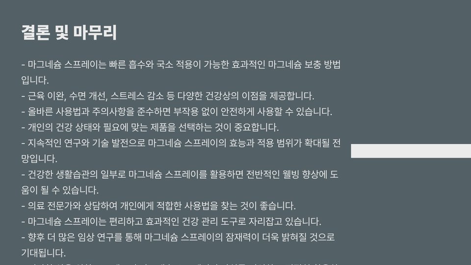 이러한 점들을 종합해 볼 때, 마그네슘 스프레이는 단순한 보충제를 넘어 일상생활에서 유용한 아이템으로 자리잡을 수 있습니다. 특히, 격렬한 운동을 하는 사람이나 스트레스가 많은 환경에서 일하는 사람들에게는 더욱 필요할 수 있습니다. 마그네슘의 이점을 직접 체험해 보기 위해 소량을 사용해보고 체험하는 것을 추천합니다.