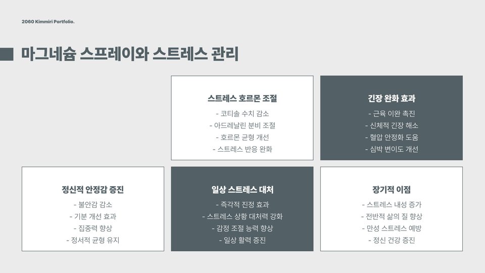 마그네슘 스프레이의 가장 큰 장점 중 하나는 근육통 완화입니다. 특히, 운동 후 심한 근육통이 발생할 경우 스프레이를 해당 부위에 뿌리면 빠르게 통증을 줄일 수 있습니다. 이외에도 마그네슘은 체내 염증을 감소시키고 스트레스를 완화하는 데 도움이 됩니다. 이러한 효과는 체내 마그네슘 농도가 낮아질 경우 제대로 이뤄지지 않기 때문에, 일상적으로 마그네슘을 보충하는 것이 중요합니다.