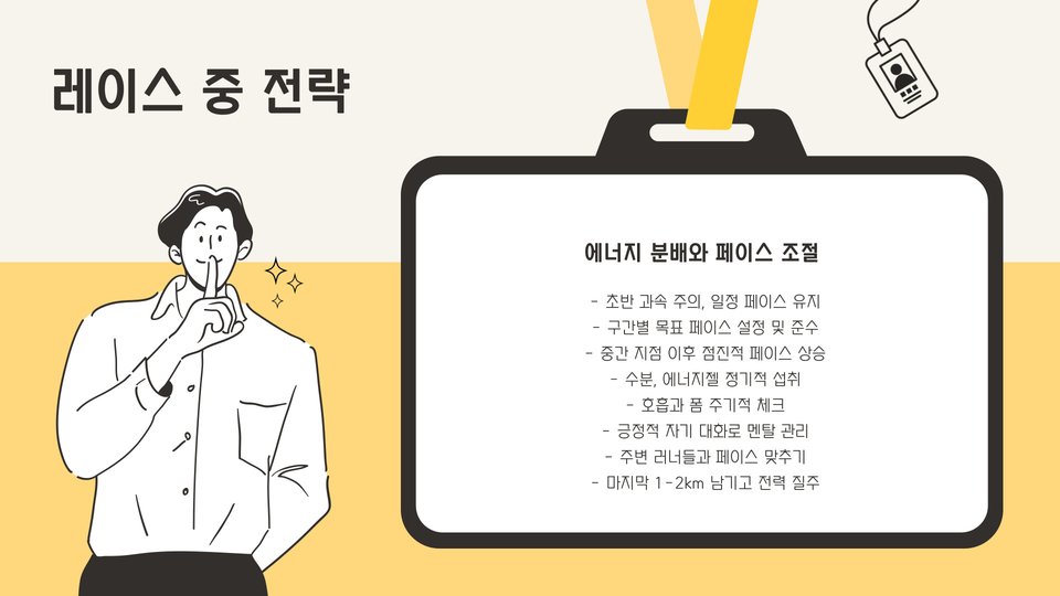 경기 중에는 목표 페이스를 유지하는 것이 중요합니다. 시작할 때는 지나치게 빠르지 않도록 주의하고, 중반부에 페이스를 벌어지지 않게 조절하며, 마지막 2km를 남기고 힘을 쏟는 것이 좋습니다. 계획한 보급 지점에서 적절히 수분과 영양을 보충하면서 최상의 페이스로 나아가세요.