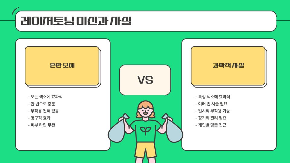 색소침착 레이저 토닝은 특정 파장의 레이저 빛을 이용하여 피부 속 색소를 분해하는 방법입니다. 이 과정에서 레이저가 피부에 전달되면 색소가 파괴되고, 이후 체내의 자연 치유 과정을 통해 색소가 몸 밖으로 배출됩니다. 이 치료는 고통이 적고 회복 시간이 짧아 많은 사람들이 선호합니다.