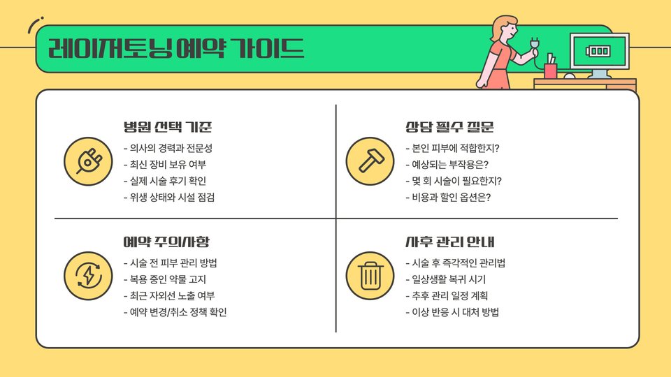 레이저 토닝 치료를 결심하셨다면, 예약은 매우 중요한 단계입니다. 최근 많은 병원에서는 온라인 예약 시스템을 운영하고 있습니다. 이를 통해 더욱 간편하게 시술 예약을 할 수 있을 뿐 아니라, 최신 할인정보나 프로모션도 확인할 수 있습니다.
