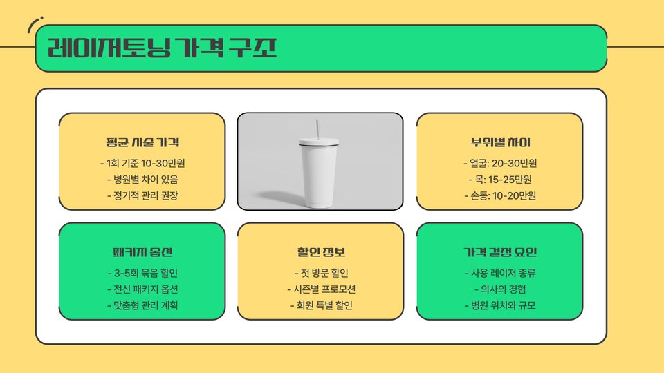 색소침착 레이저 토닝의 가격은 클리닉과 치료 부위에 따라 다릅니다. 보통 1회 치료에 10만 원에서 30만 원 정도의 비용이 발생합니다. 또한, 여러 번의 치료가 필요할 수 있으므로 전체 치료 비용은 상당히 높아질 수 있습니다. 따라서 치료 전에 클리닉에서 정확한 가격을 문의하는 것이 중요합니다.