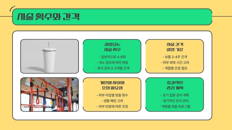 마지막으로, 시술 주기 역시 중요합니다. 일반적으로는 4주 간격으로 3~5회 시술을 받는 것이 효과적입니다. 그러나 개인의 피부 상태에 따라 다를 수 있으므로, 이를 전문가와 상의하여 최적의 주기를 설정하는 것이 좋습니다.