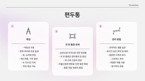 편두통의 경우, 진통제를 복용하거나, 발생하는 빈도를 줄이기 위한 생활습관 개선이 필요합니다. 스트레스 해소를 위한 요가나 명상도 도움이 될 수 있습니다.