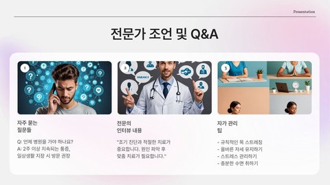 정확한 진단을 위해 전문가의 조언과 치료를 받는 것이 최선의 방법입니다. 통증이 지속되거나 심해질 경우, 반드시 전문의의 상담과 진료를 받으세요.