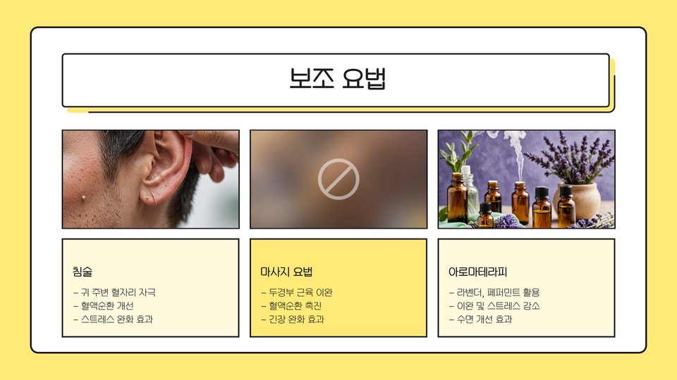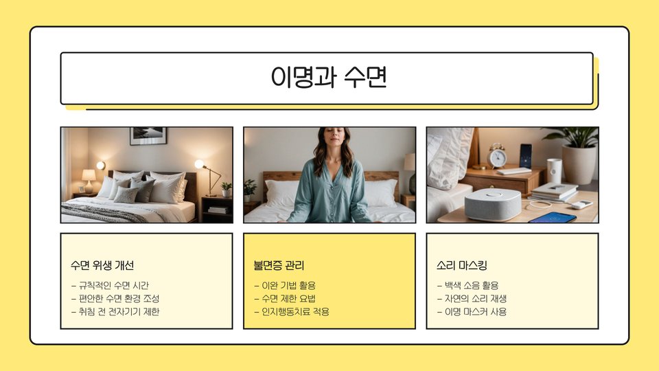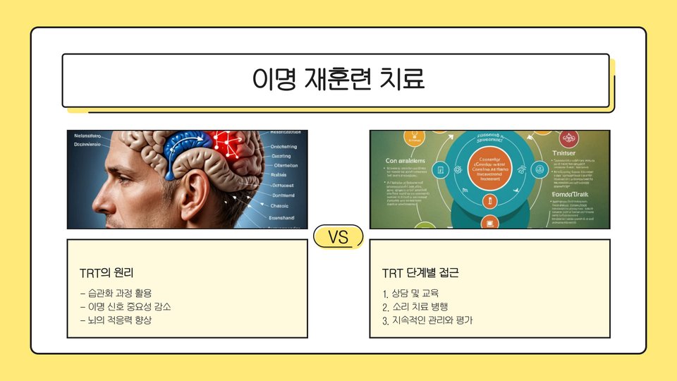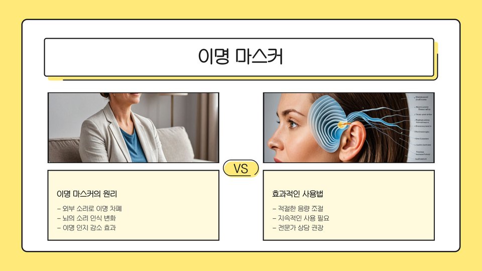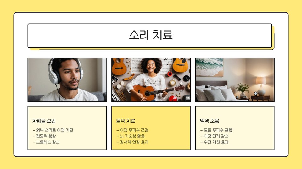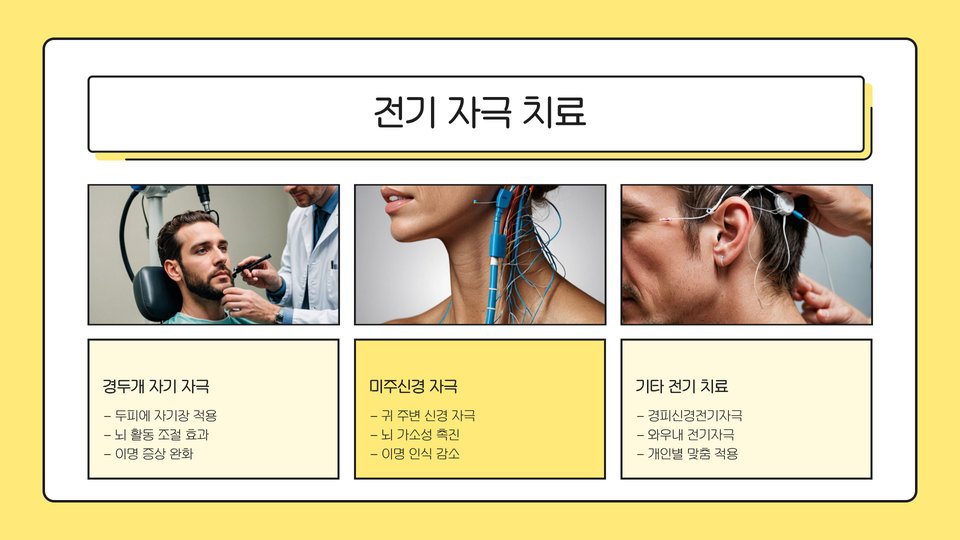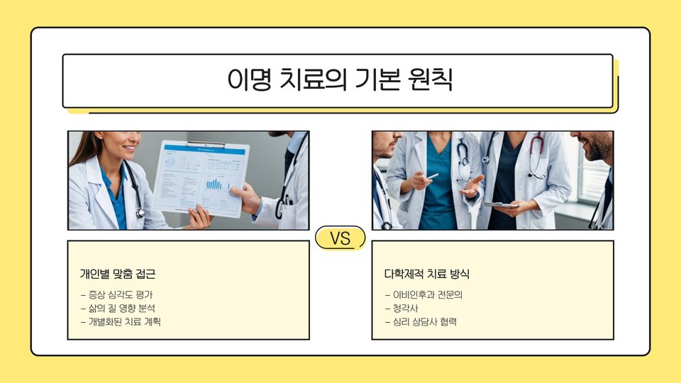 소리 요법은 예시로서, 백색 소음기를 이용해 이명 소음을 덮어주는 방식입니다. 이 방법은 특히 수면에 어려움을 겪는 환자에게 유용합니다. 인지 행동 치료는 이명으로 인한 불안을 줄이고, 긍정적인 사고로 전환하는 데 도움을 줄 수 있습니다.
