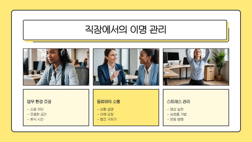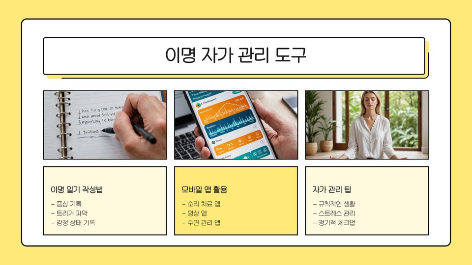이명을 관리하는 데 있어 자기 관리 또한 중요합니다. 스트레스 관리는 이명 증상을 완화하는 데 크게 기여할 수 있습니다. 요가, 명상, 혹은 심호흡 운동 등을 통해 스트레스를 줄이는 방법을 표코하는 것이 좋습니다.