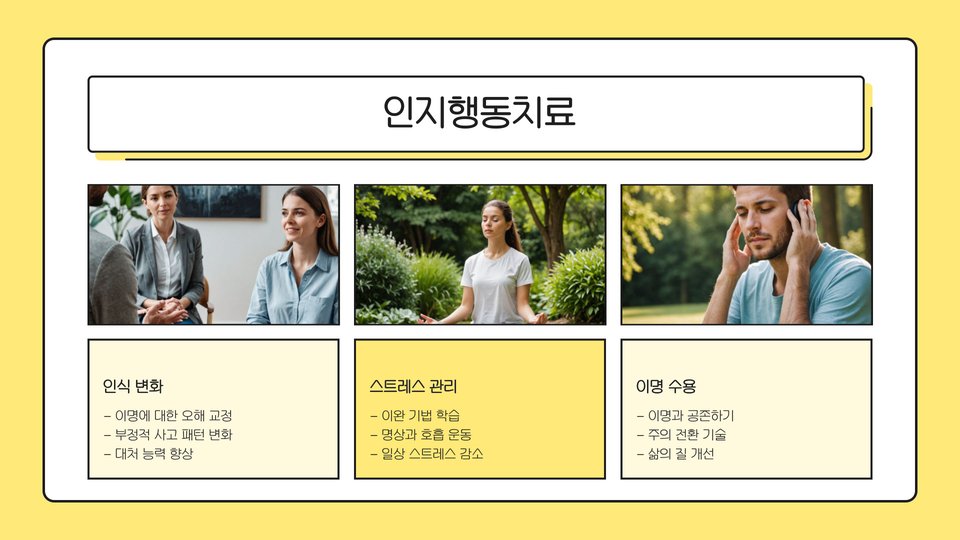 | 인지 행동 치료 | 심리적 접근으로 증상을 완화 |