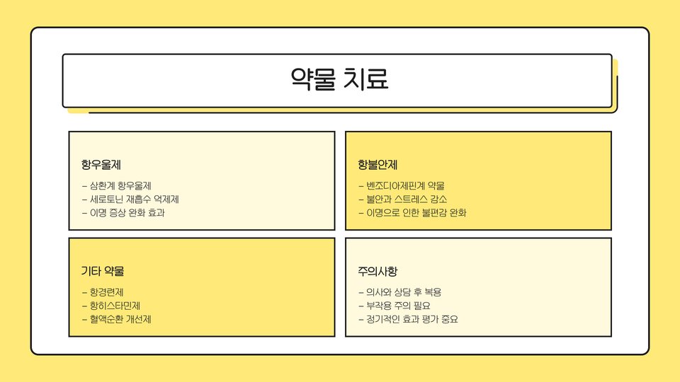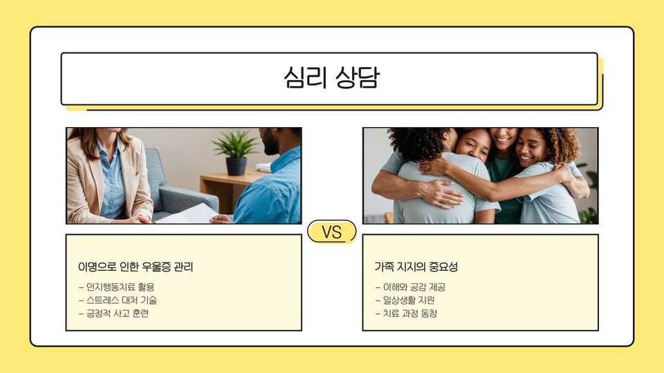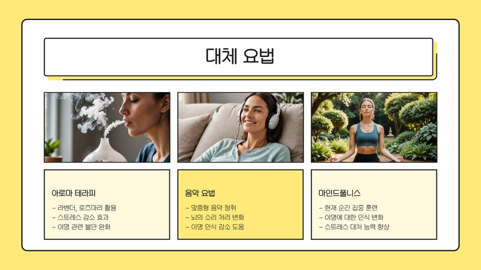 | 인지 행동 치료 | 불안 감소 및 긍정적인 사고 전환 |