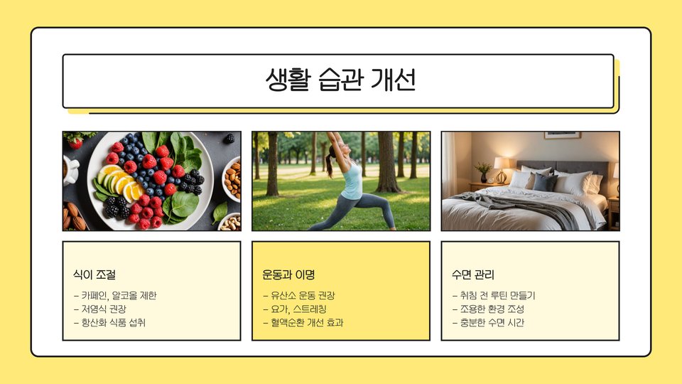 이명을 효과적으로 관리하기 위해서는 생활 습관 개선이 필요합니다. 특히 스트레스를 관리하고, 충분한 수면을 취하는 것이 중요합니다. 규칙적인 운동과 건강한 식습관은 신체적, 정신적 건강을 증진시켜 이명의 증상을 완화하는 데 도움을 줄 수 있습니다.