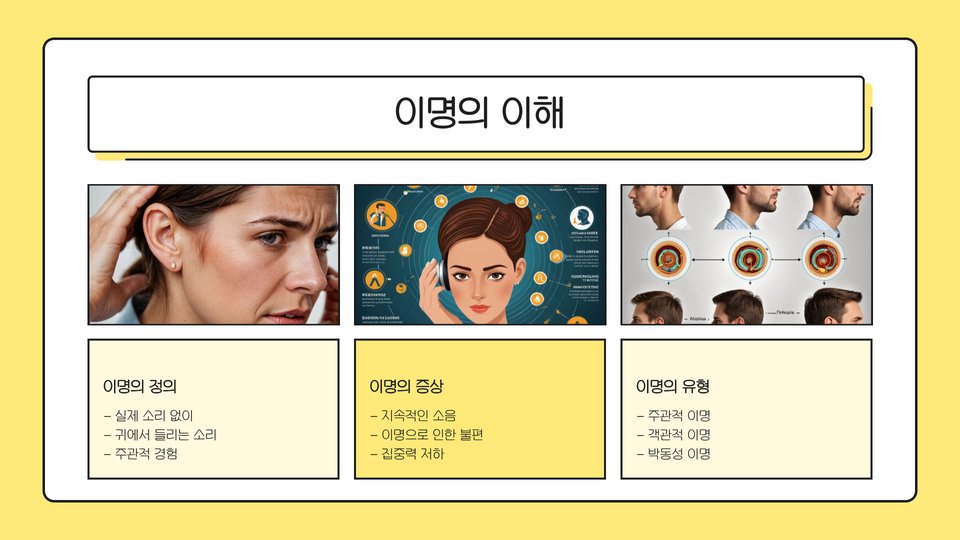 이명은 귀에서 소리가 나는 현상으로, 외부 소음이 없는 상태에서도 발생할 수 있습니다. 이명은 정의하자면, 귀 내부의 신경이 비정상적으로 활동하여 발생하는 소음입니다. 이명은 주로 스트레스, 귀의 손상, 또는 청력 손실과 관련이 깊습니다. 많은 사람들이 이명을 경험하지만, 그 정도와 빈도는 개인마다 다릅니다.