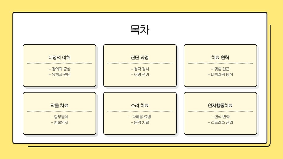 - 이명을 인정하고 수용하는 과정이 중요하다.