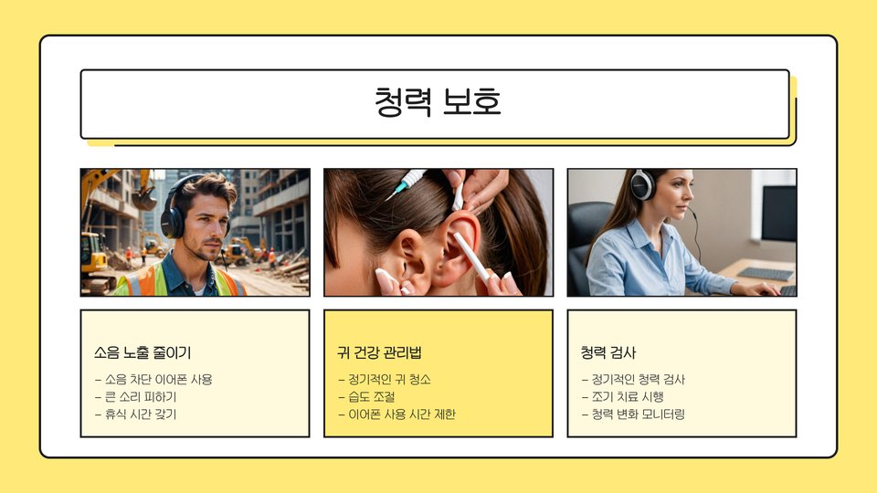 주변 환경 소음도 중요한 요소입니다. 귀가 민감한 경우 소음이 많은 환경은 피하는 것이 좋습니다. 청력 보호를 위해 이어플러그를 사용하거나 시끄러운 소음을 피하는 것이 필요합니다.
