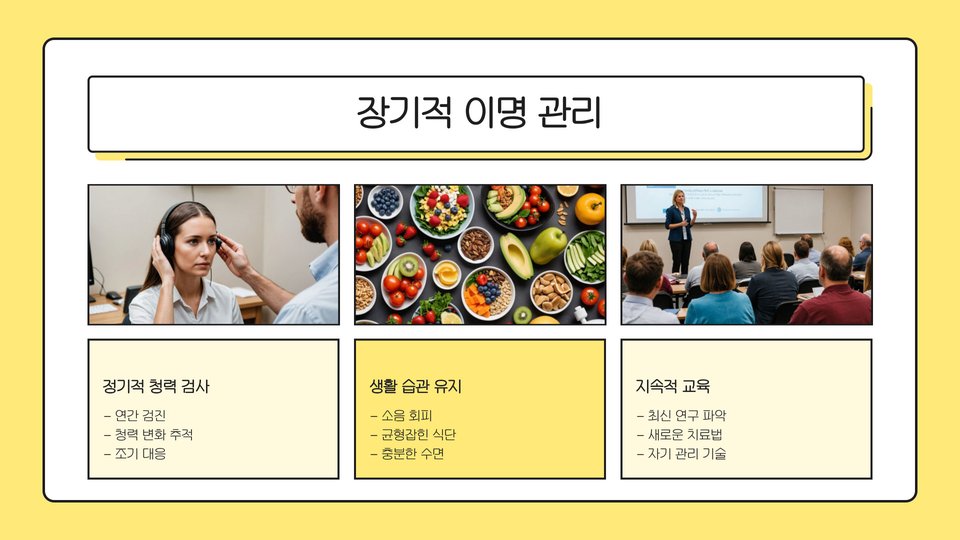 이명의 증상이 완전히 사라지지 않더라도, 이를 관리하고 생활에 지장을 주지 않도록 하는 것이 중요합니다. 정신적 안정과 긍정적인 태도를 유지하는 것이 이명과의 관계를 건강하게 설정하는 데 큰 도움이 됩니다. 이명을 인정하고, 그에 맞춰 생활 방식을 조정하는 것이 필요합니다.