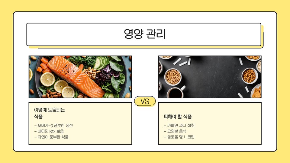 또한, 카페인과 알코올 섭취를 줄이는 것이 좋습니다. 이들은 이명 증상을 악화시킬 수 있습니다. 대신, 수분 섭취를 늘리고, 신선한 과일과 채소를 충분히 섭취하는 것이 좋습니다.