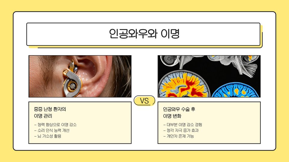 이명에 대한 이해를 높이고, 이를 수용하는 과정에서 긍정적인 변화가 일어날 수 있습니다. 필요한 경우, 전문가의 도움을 받아 상담 치료를 받는 것도 좋은 방법입니다. 이는 이명으로 인한 불안을 줄이고, 일상생활의 질을 높이는 데 기여할 수 있습니다.