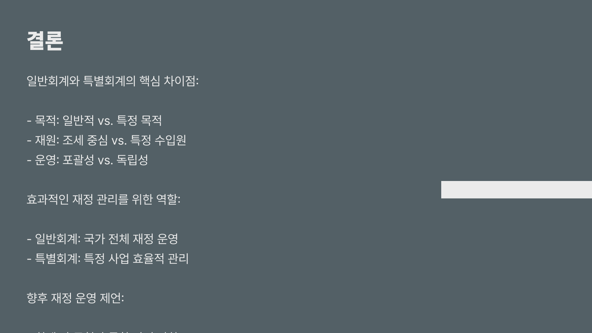 - 일반회계는 전체 재정 상태를 파악하는 데 필수적