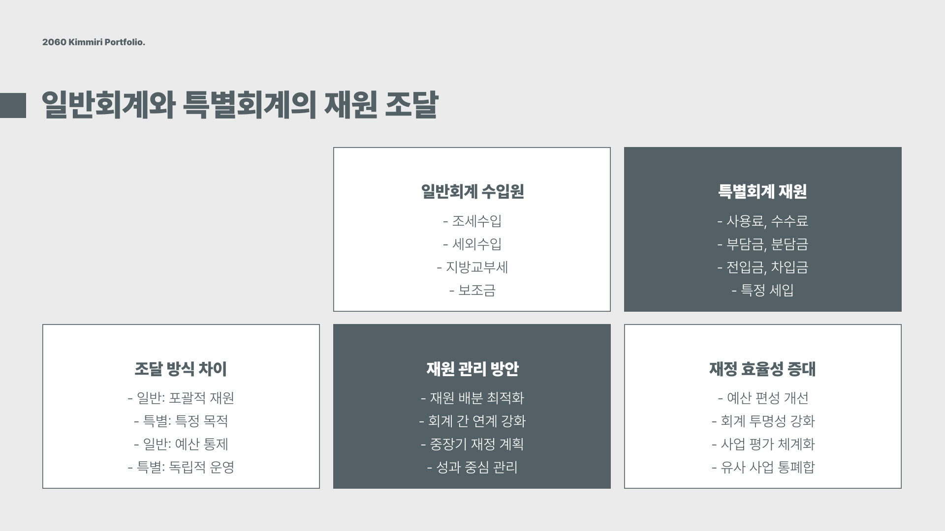 - 일반회계는 국민의 세금으로 운영되며, 특별회계는 특정 세입원을 가집니다.