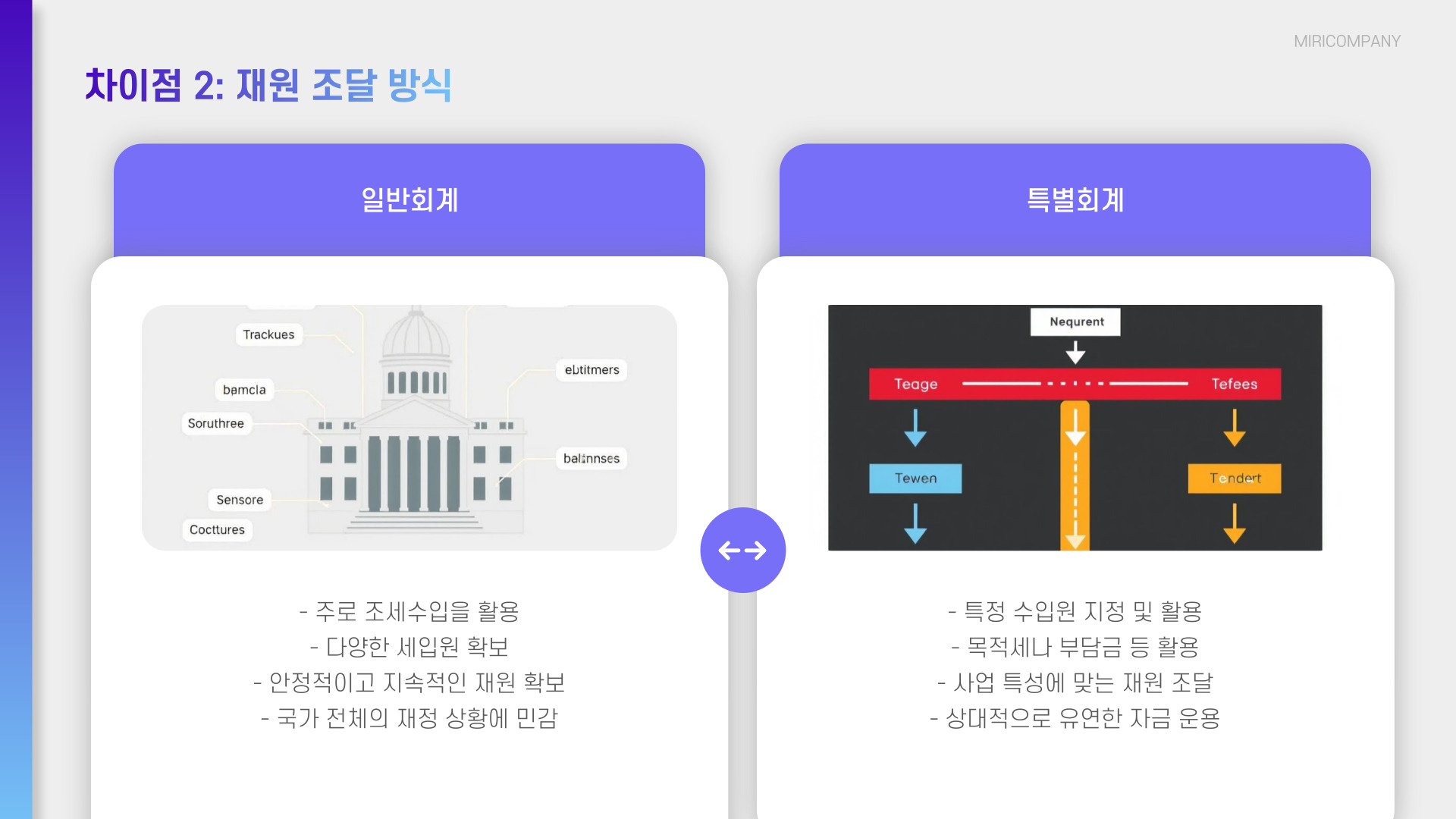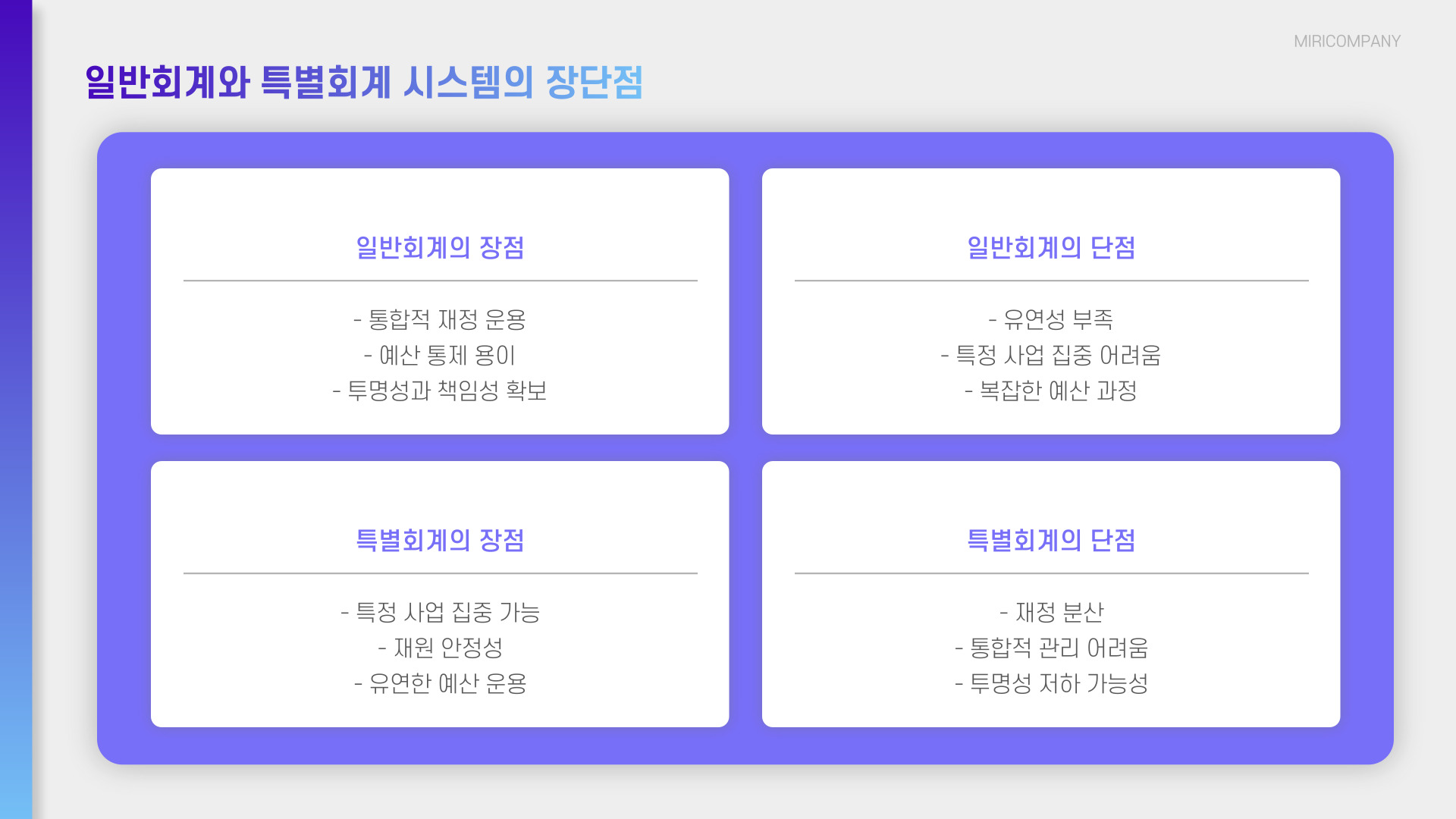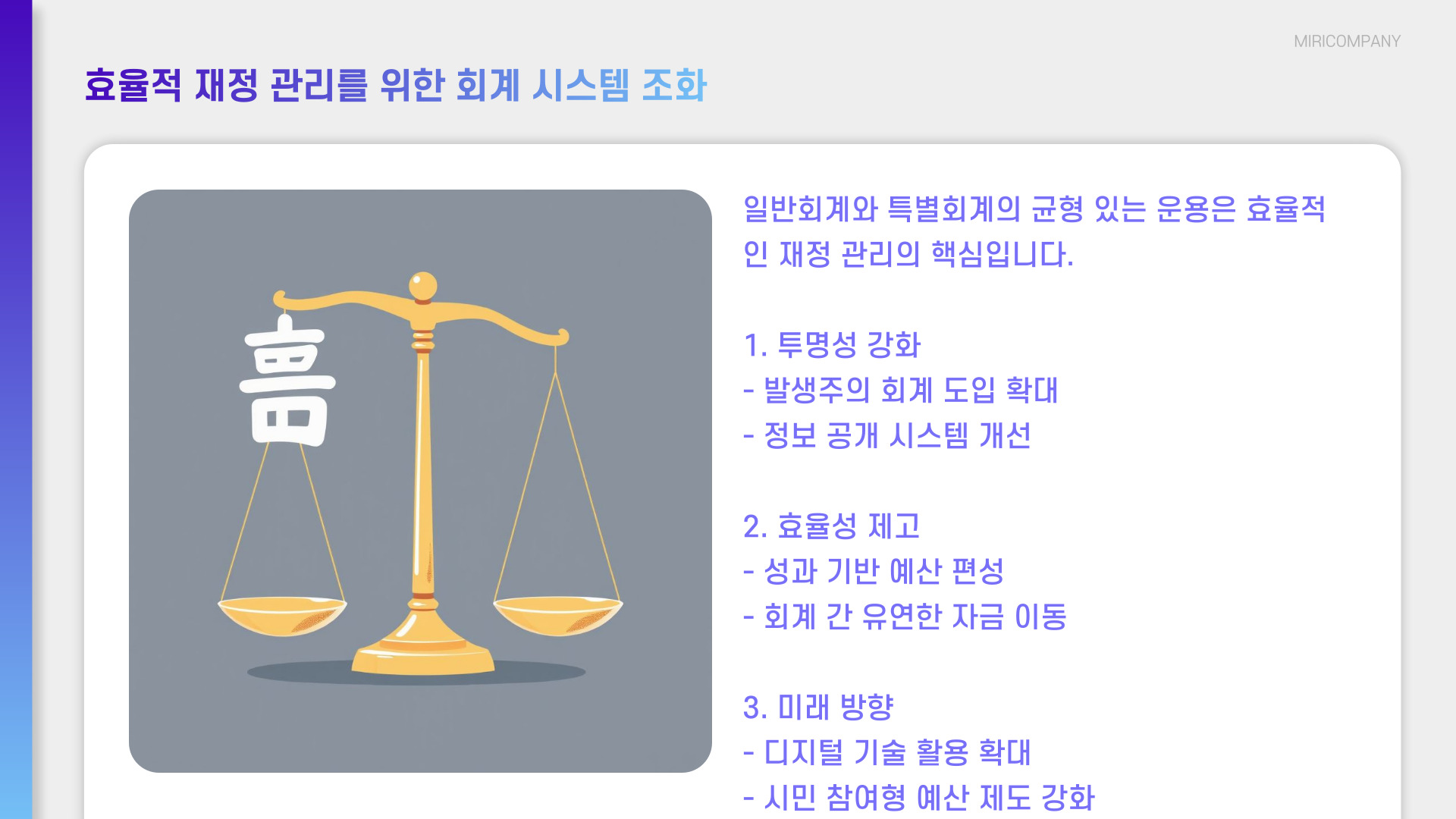 - 일반회계는 총체적 재무 관리, 특별회계는 특정 목적에 국한됨.