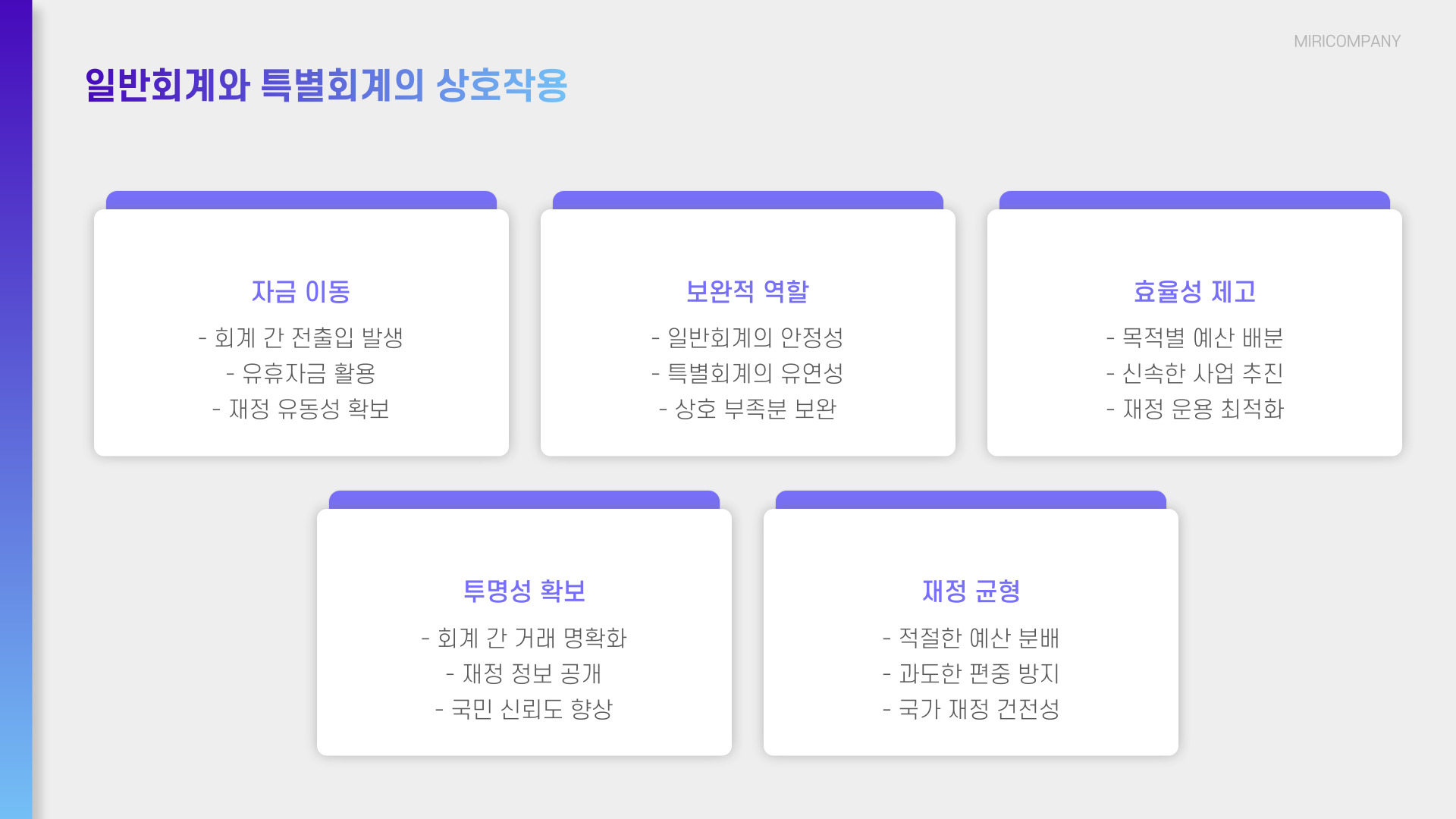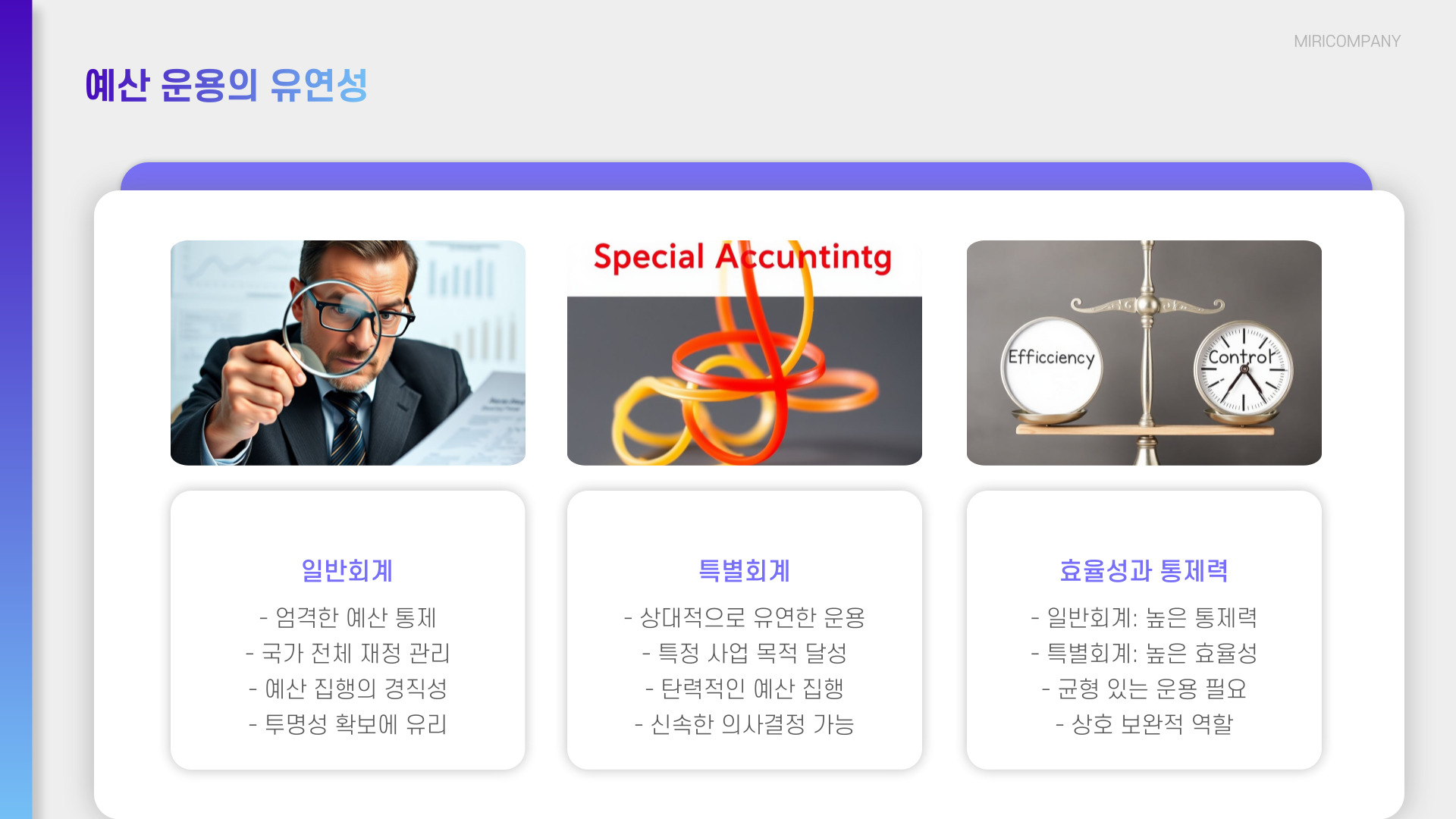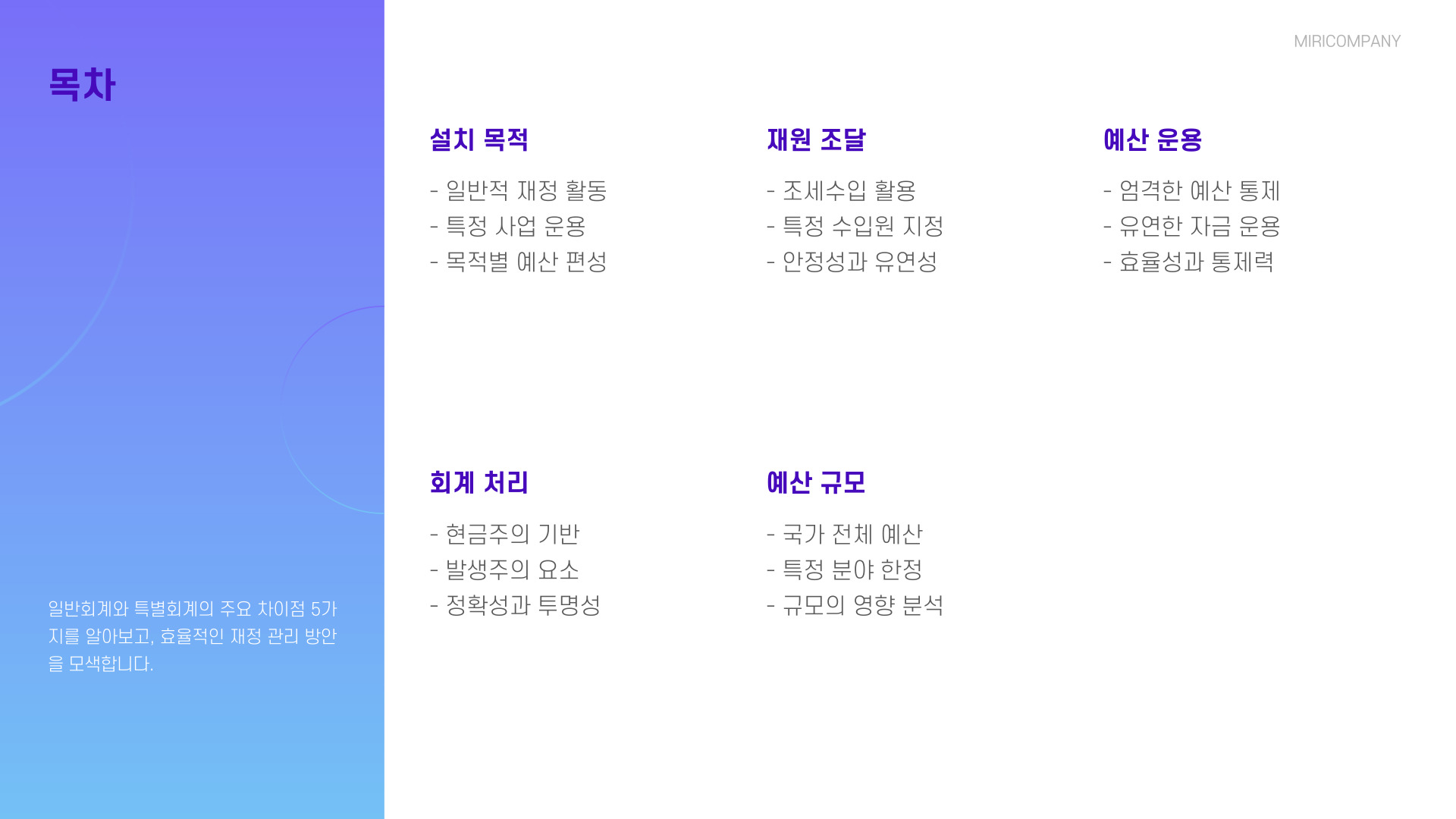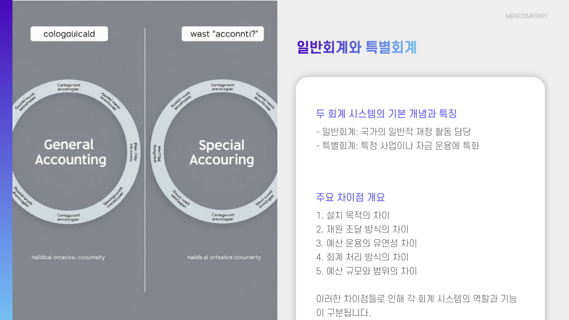 - 일반회계는 총체적 재무 관리, 특별회계는 특정 목적에 국한됨.