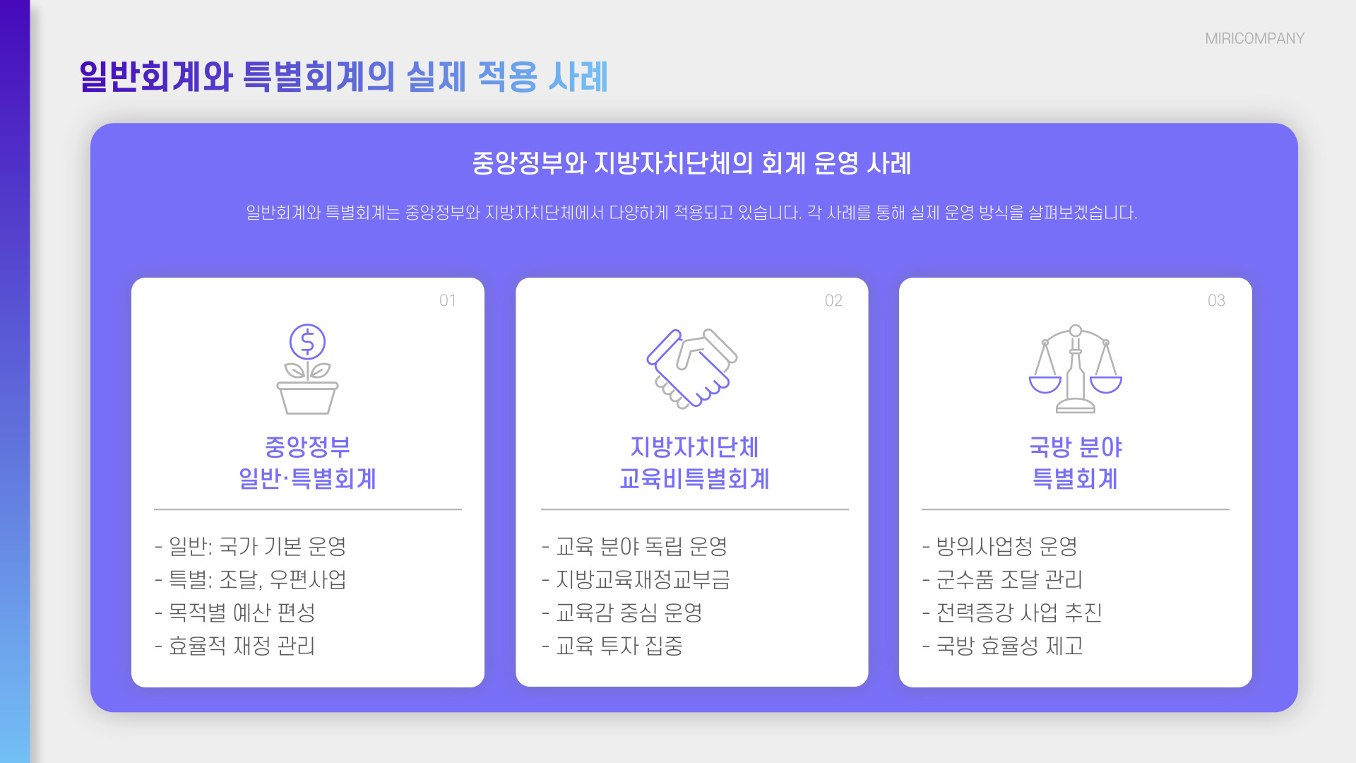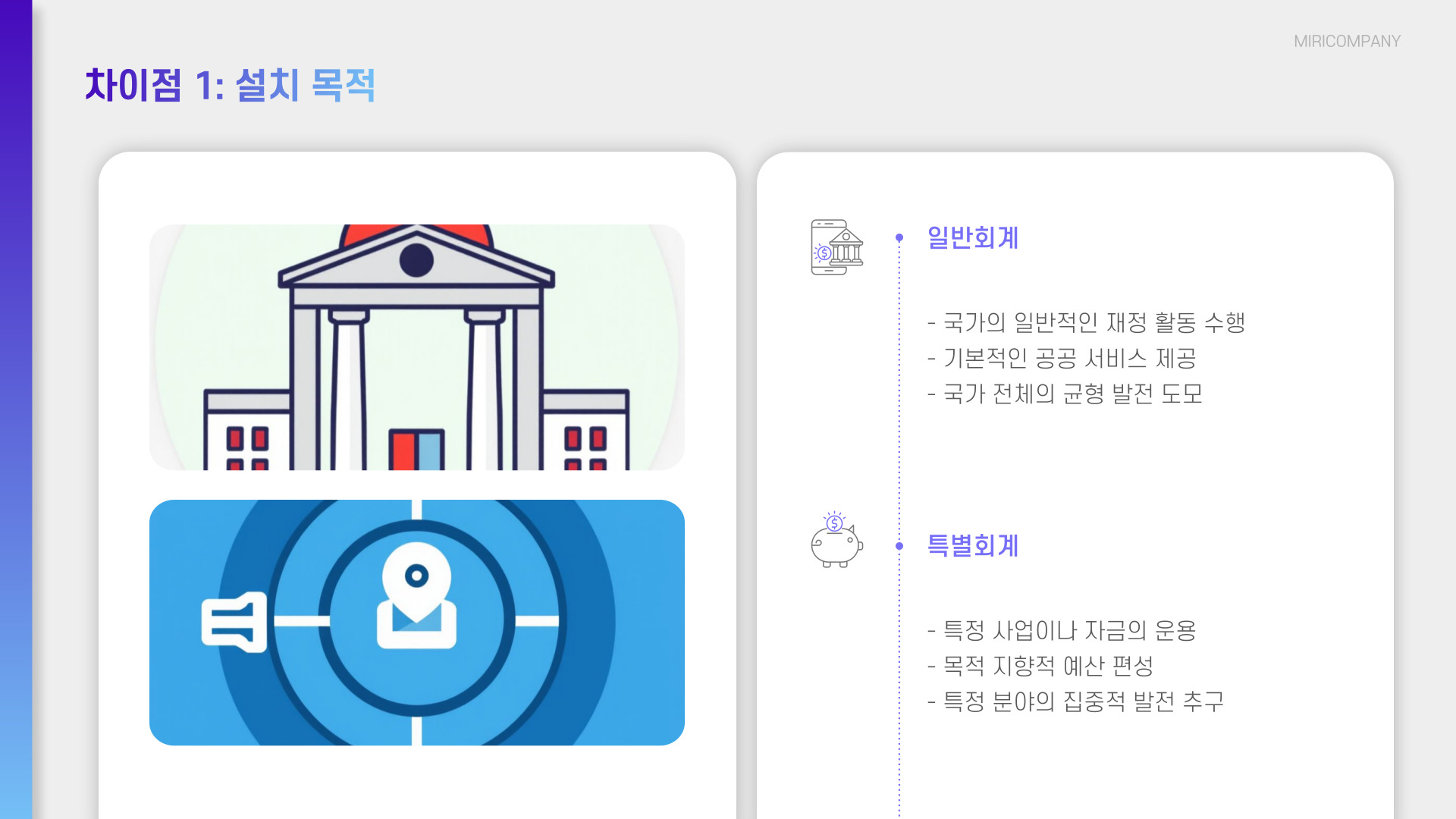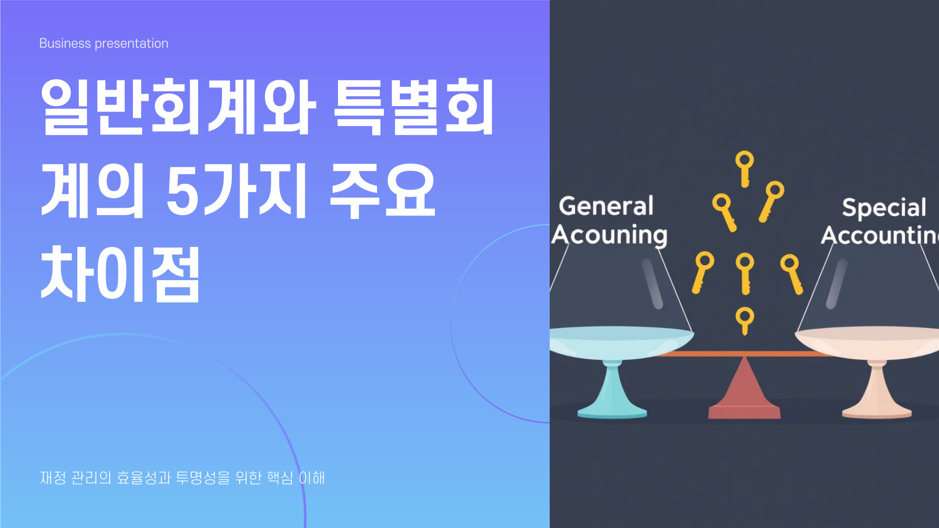 - 일반회계는 총체적 재무 관리, 특별회계는 특정 목적에 국한됨.