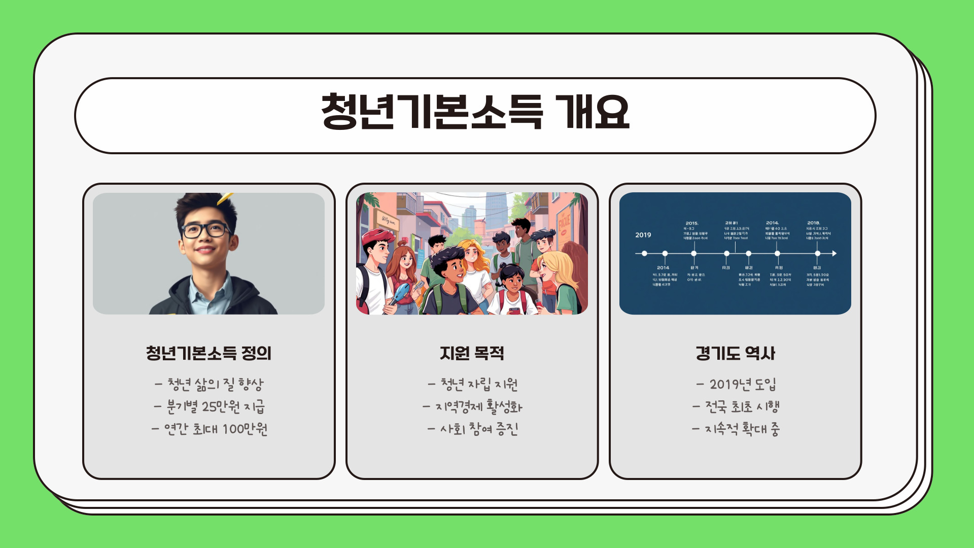 청년기본소득은 만 19세에서 29세 사이의 청년에게 매달 일정 금액을 지원하는 제도입니다. 이 제도는 경제적 어려움을 겪고 있는 청년들에게 기반 자금을 제공하여 자립을 도모하도록 돕고 있습니다. 한국의 청년들은 다양한 사회경제적 문제로 인해 어려움을 겪고 있으며, 청년기본소득은 이러한 문제를 해결하는 한 가지 방법이 될 수 있습니다.