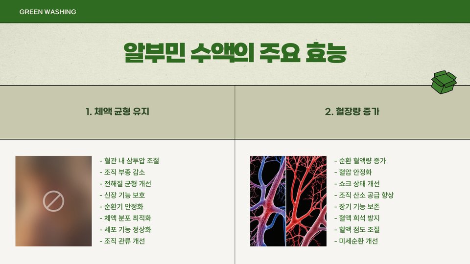 | Albumin 5% | 5% | 경도 저알부민증 | 체내 수분 균형 |