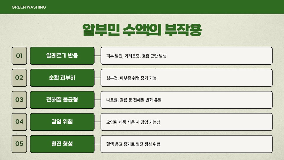 또한, 심부전, 신장 질환, 또는 간 질환을 앓고 있는 환자는 사용 시 주의해야 하며, 의사와 상담 후 적절한 용량 조절이 필요합니다. 알부민 수액은 너무 오래 보관할 수 없기 때문에 사용 기한을 반드시 확인하고, 유통기한이 지난 제품은 사용을 피해야 합니다.