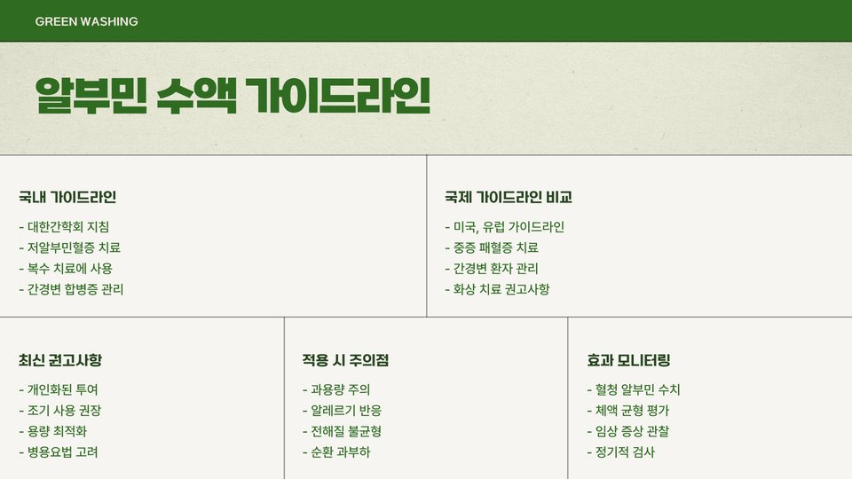 마지막으로, 알부민 수액은 항상 적절한 지침에 따라 주입해야 하며, 과도한 용량은 수분 저류 등 여러 부작용을 일으킬 수 있습니다. 각 환자의 상태에 따른 세심한 관찰이 필수적입니다.