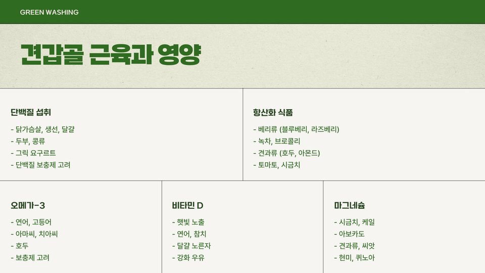 - 덤벨과 밴드를 이용한 근력 운동이 효과적입니다.
