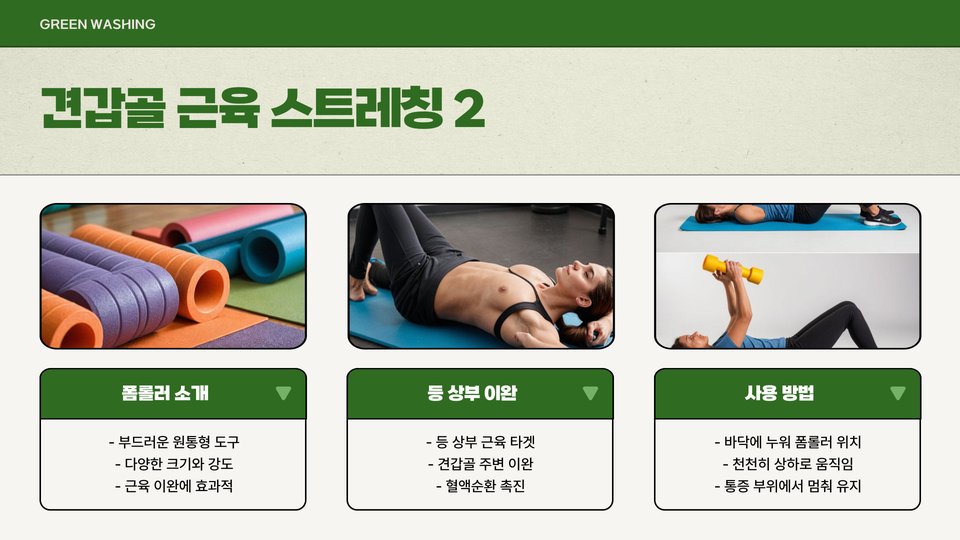 첫 번째 관리 방법은 전신 스트레칭입니다. 전신을 스트레칭하면 유연성을 높이고, 긴장을 완화시켜 견갑골 주변 근육에 긍정적인 영향을 미칩니다. 특히, 어깨와 가슴 부위를 집중적으로 스트레칭하는 것이 중요합니다.