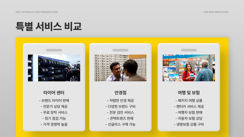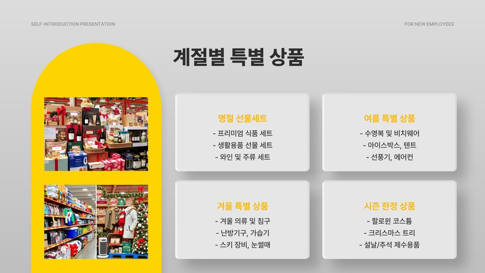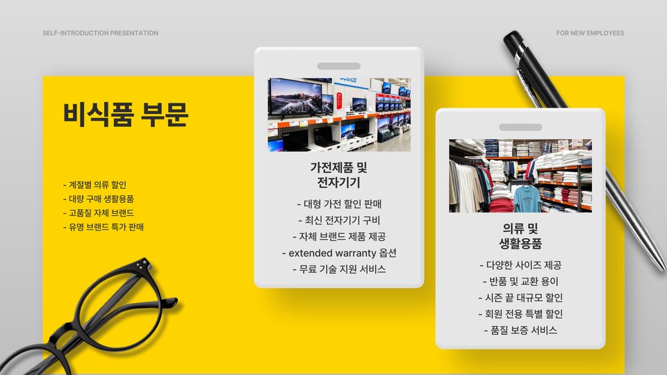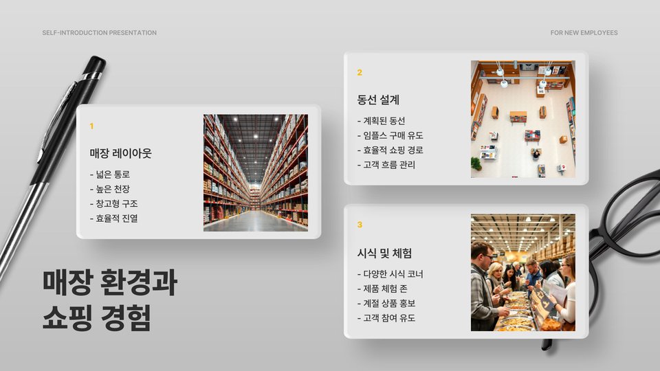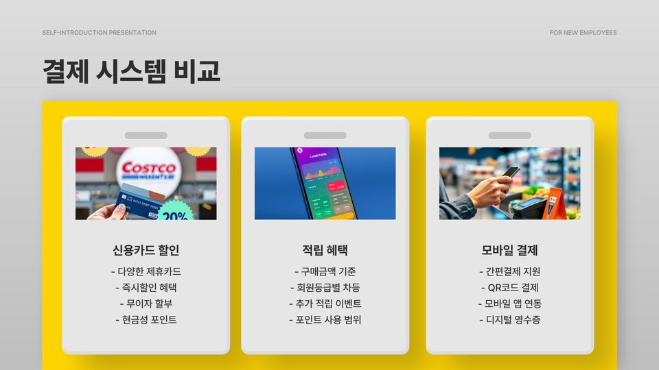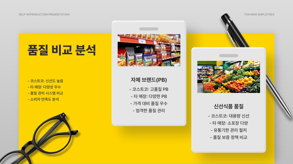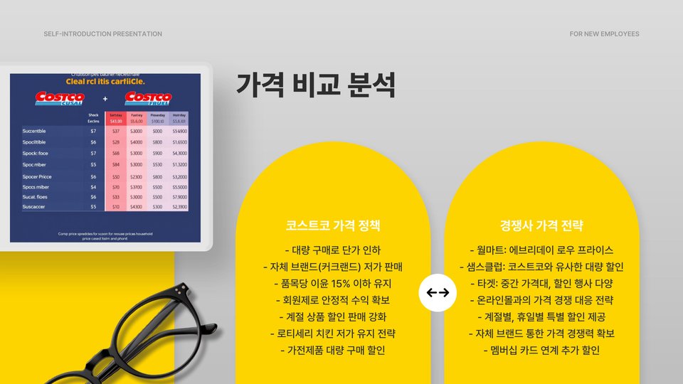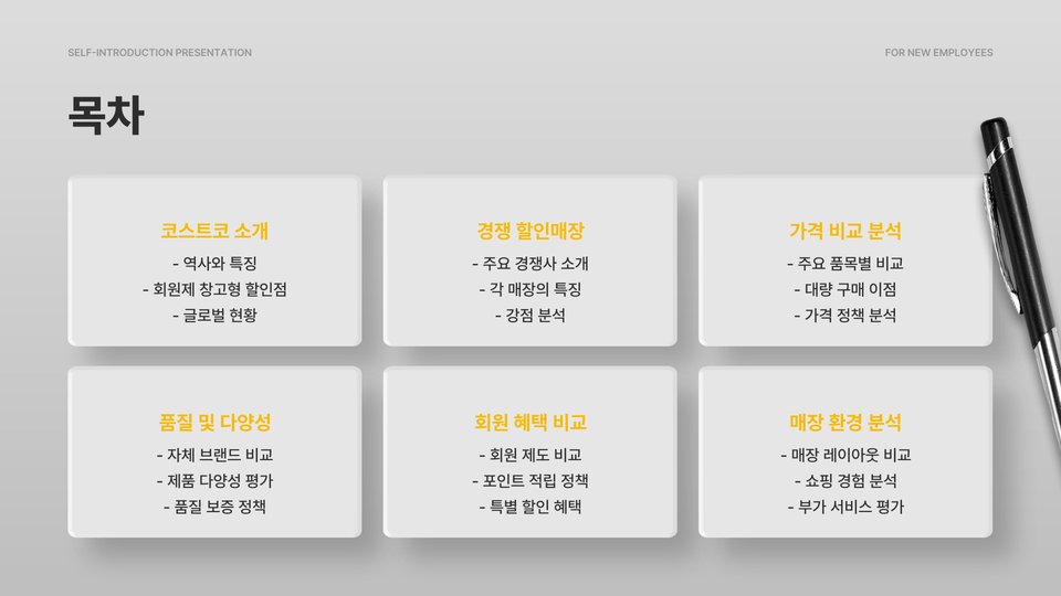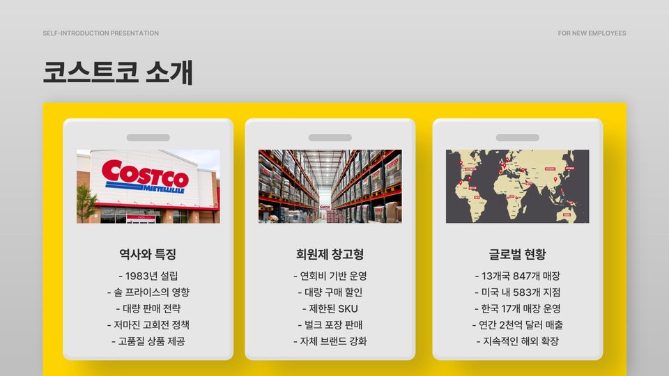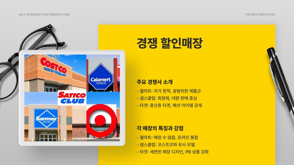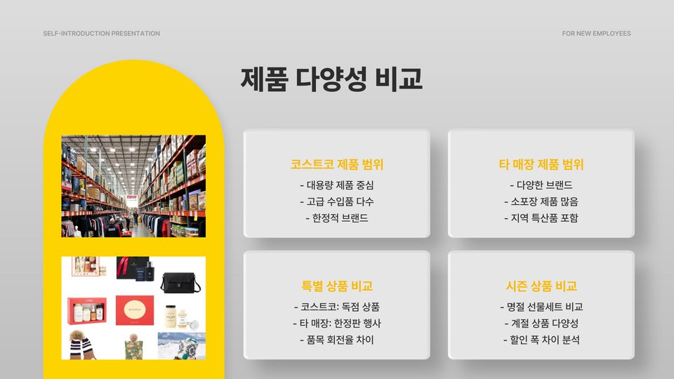 - 코스트코는 대량 구매 시 유리하고 다양한 제품을 보유하고 있음.
