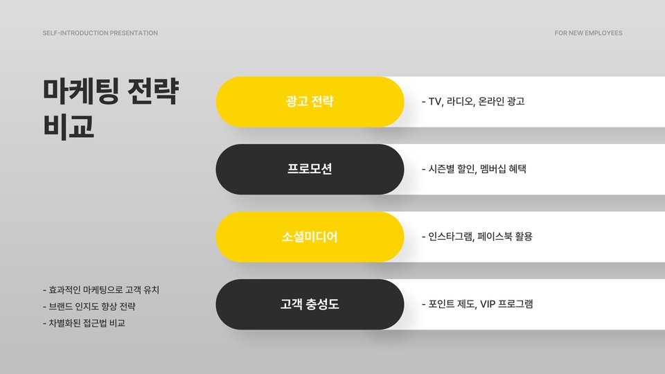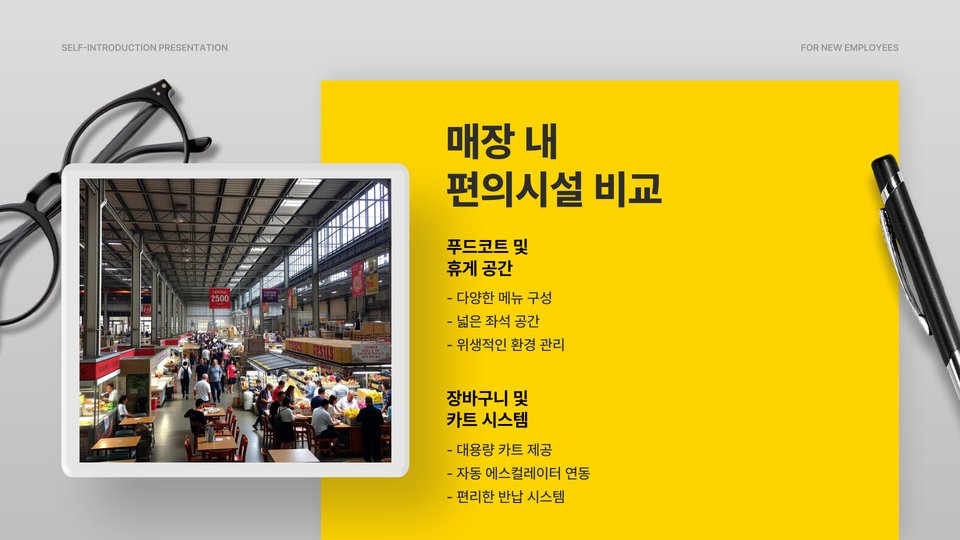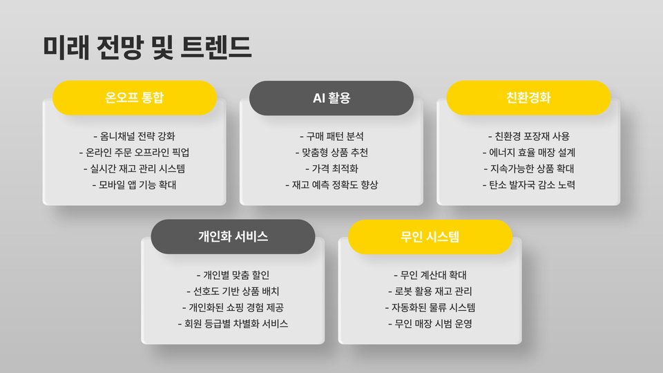 - 이마트와 롯데마트는 소량 구매에 적합하고 온라인 쇼핑이 편리함.