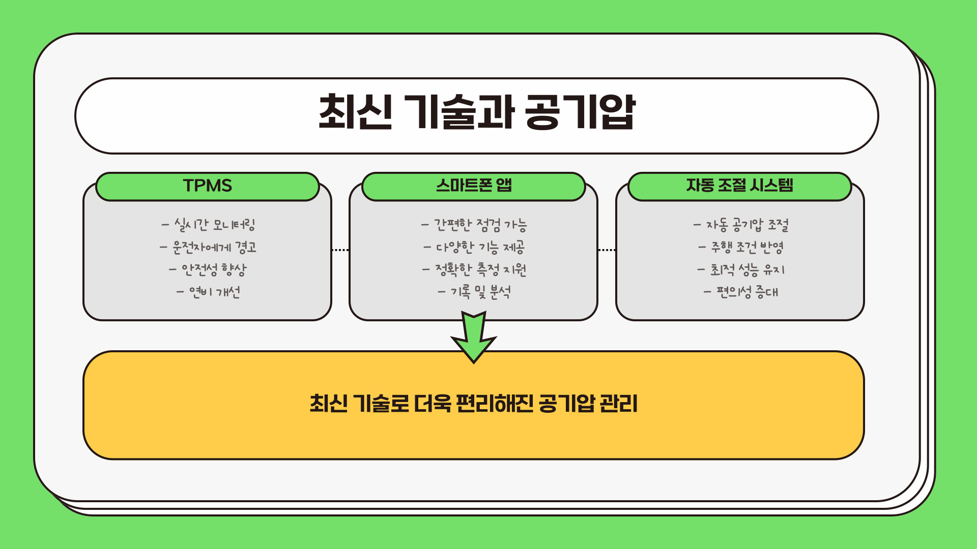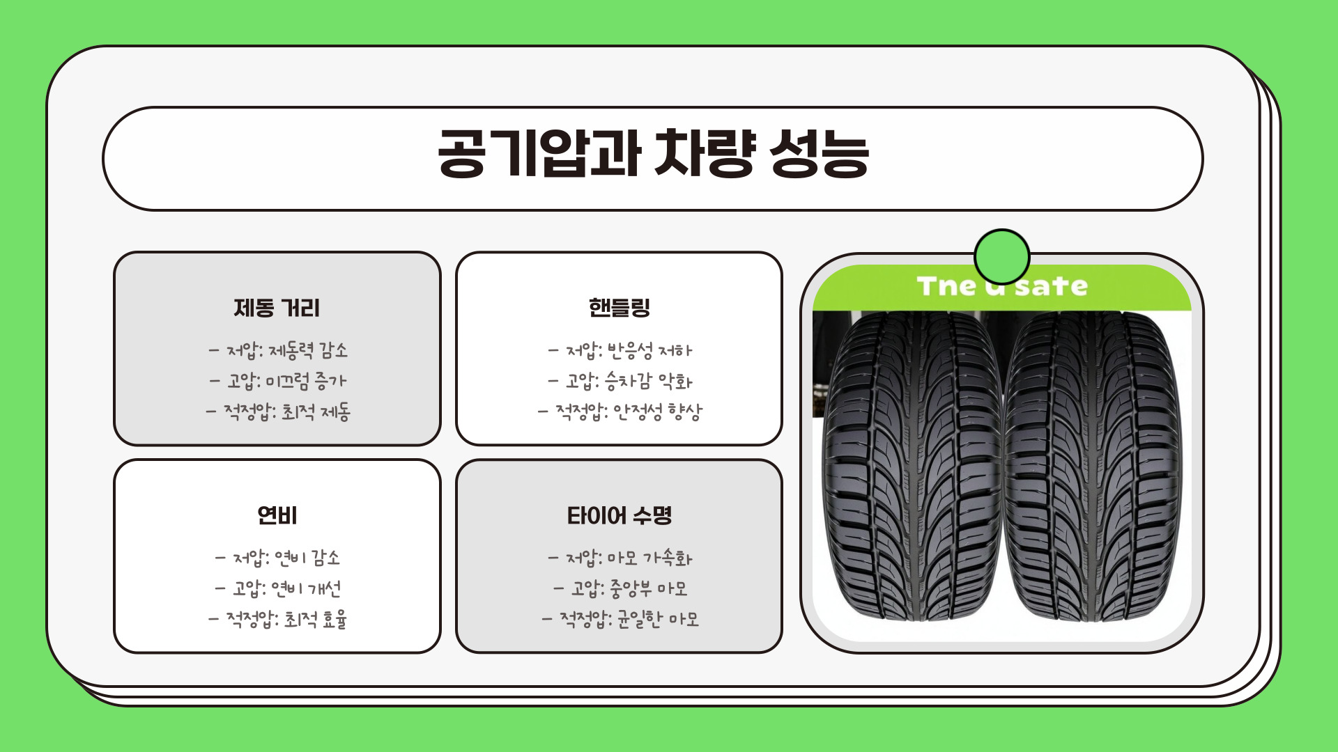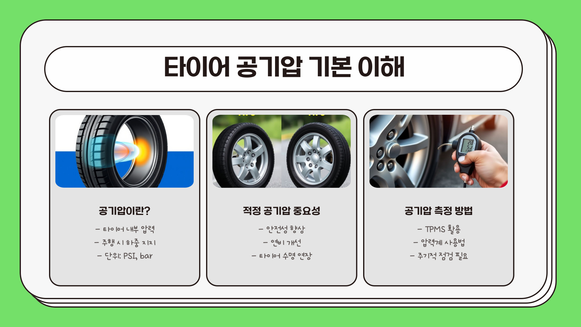 - 타이어 공기압은 차량의 안전과 성능에 매우 중요하다.