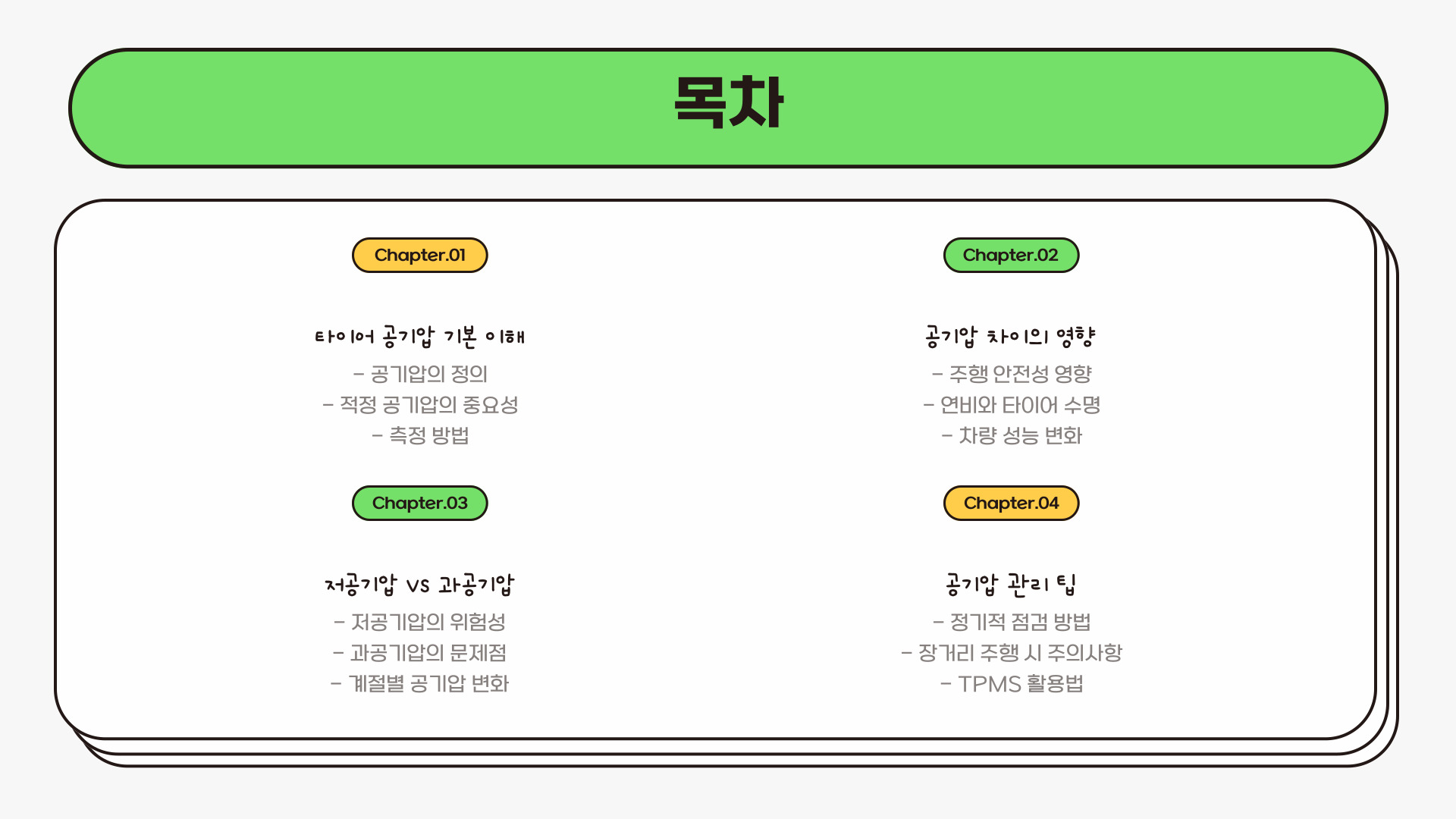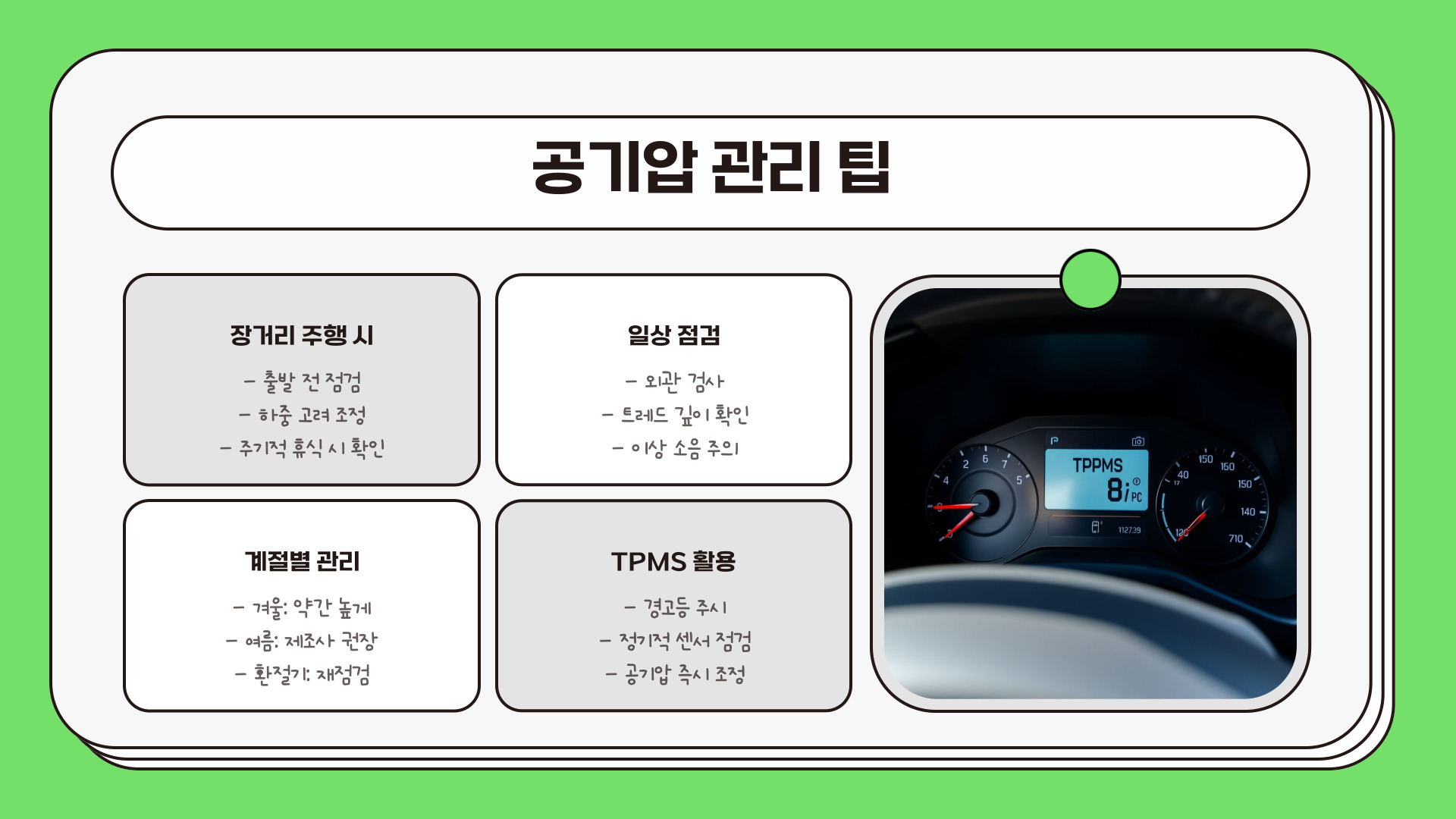 - 타이어 공기압은 차량의 안전과 성능에 매우 중요하다.