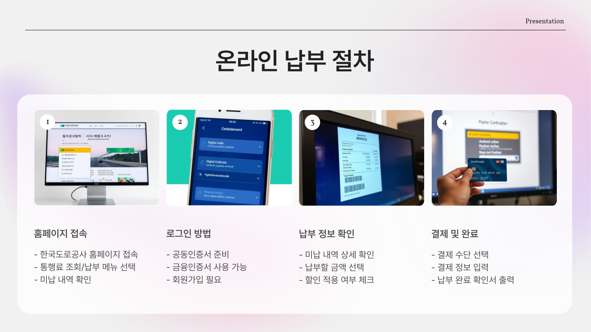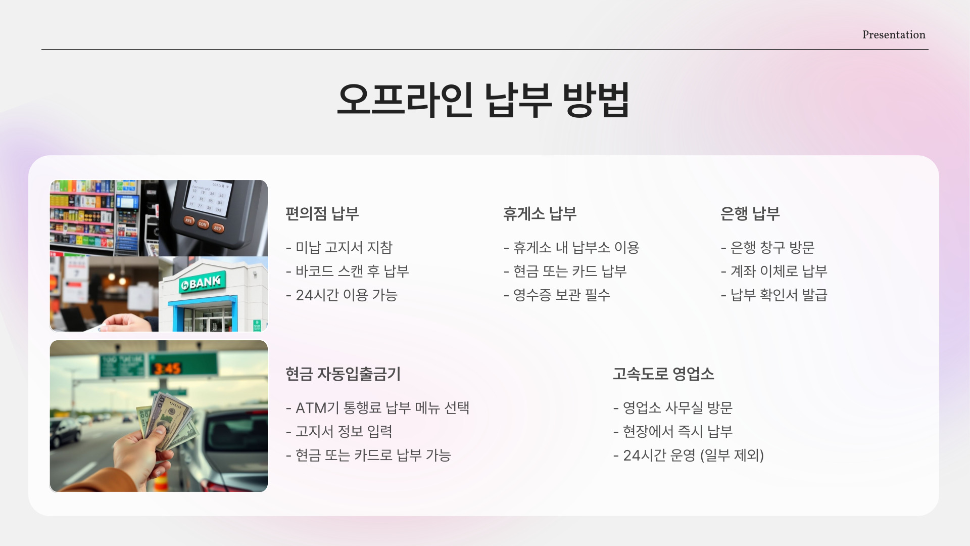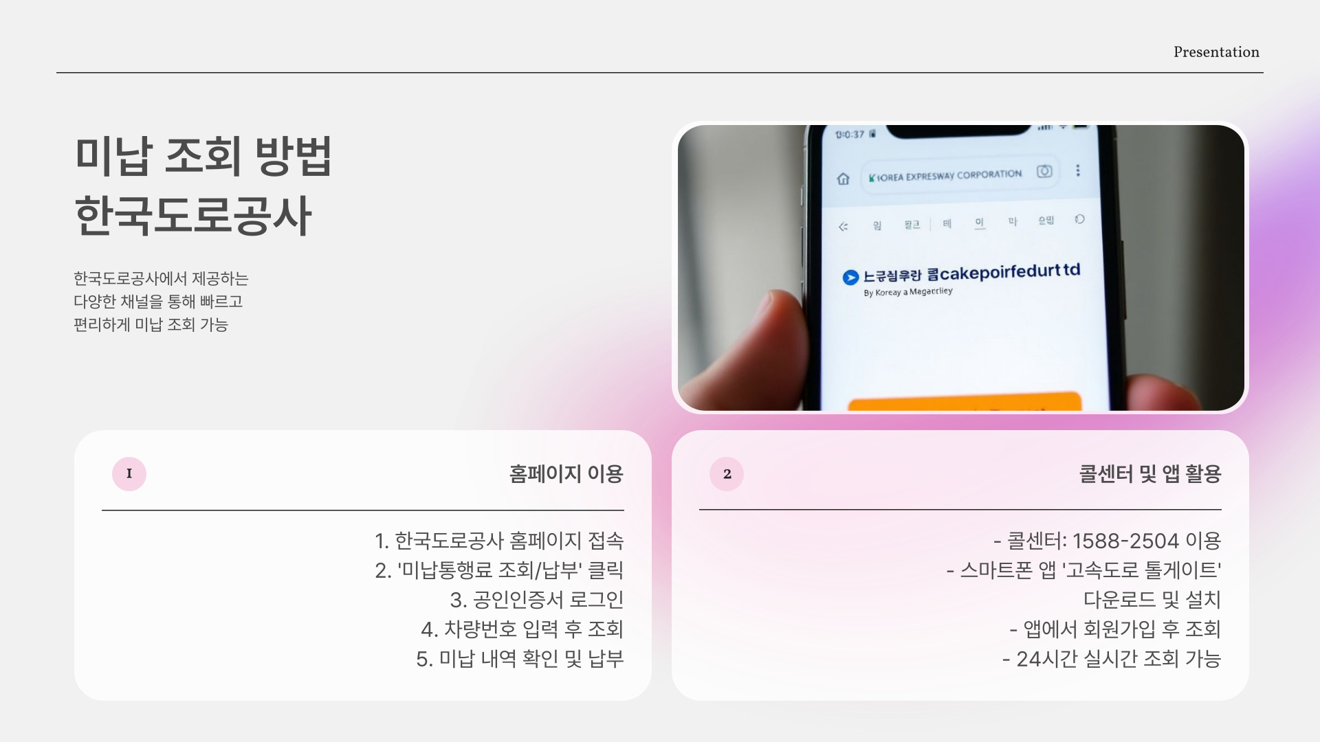 인증 후 미납통행료 내역이 나타나며, 표시된 금액을 선택해 결제 수단을 지정하여 빠르게 납부할 수 있습니다. 이 두 가지 방법은 통행료 미납 문제를 해결하는 데 매우 효과적입니다.