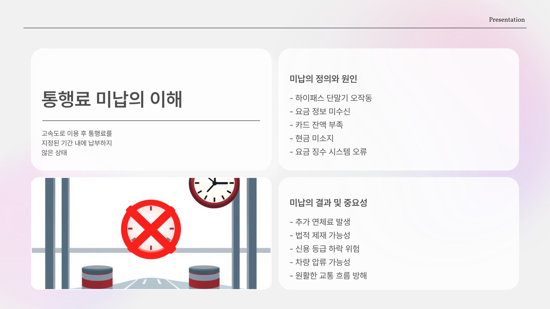 고속도로를 이용하며 자주 과속이나 통행료 미납 경고를 받을 수 있습니다. 특히 하이패스를 통해 통행료를 납부하는 경우, 단말기 작동 오류나 배터리 문제로 인해 의도치 않게 통행료가 미납되는 사태가 발생할 수 있습니다. 이러한 상황에서는 신속하게 미납 여부를 확인하고 해결책을 찾아야 합니다. 이 글에서는 통행료 미납조회를 10분 만에 해결하는 방법을 구체적으로 설명하겠습니다.