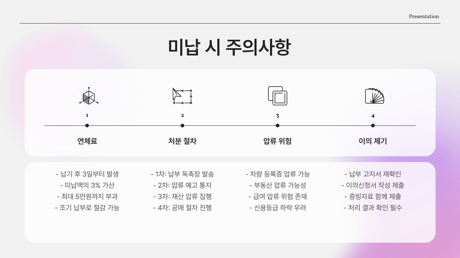고속도로를 자주 이용하면 하이패스 무단통과로 인해 통행료 미납 문제가 발생할 수 있습니다. 이러한 상황에 대비해, 통행료 조회 및 납부 방법을 미리 알아두는 것이 좋습니다. 또한, 하이패스 단말기의 작동 상태를 주기적으로 점검하여 미납에 따른 불이익을 최소화하는 것이 바람직합니다. 이를 통해 고속도로 이용 시 과태료를 예방할 수 있습니다.
