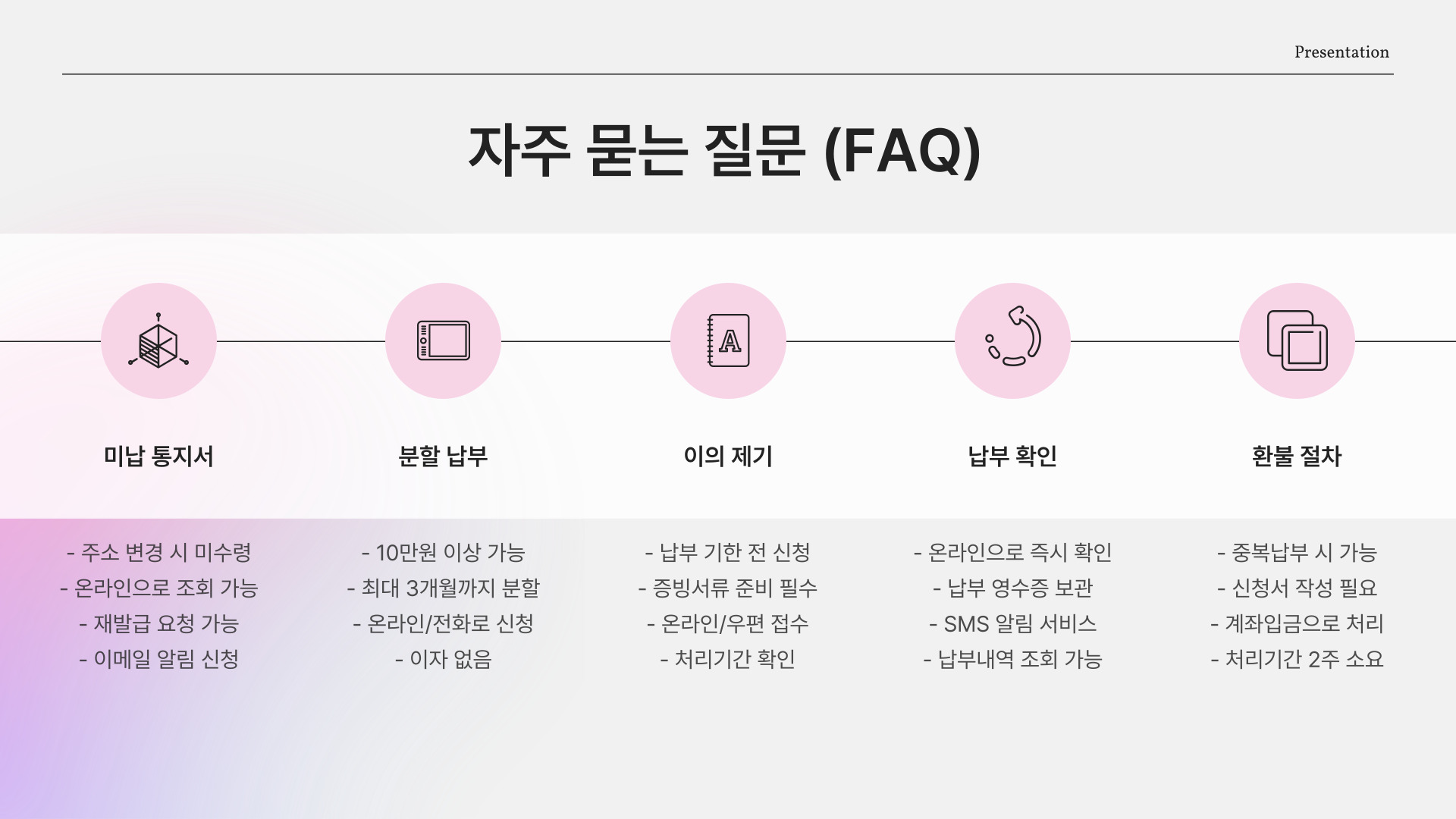 | 모바일 앱 이용 | 모바일 앱 설치 후 미납 확인 및 납부를 곧바로 할 수 있다. |